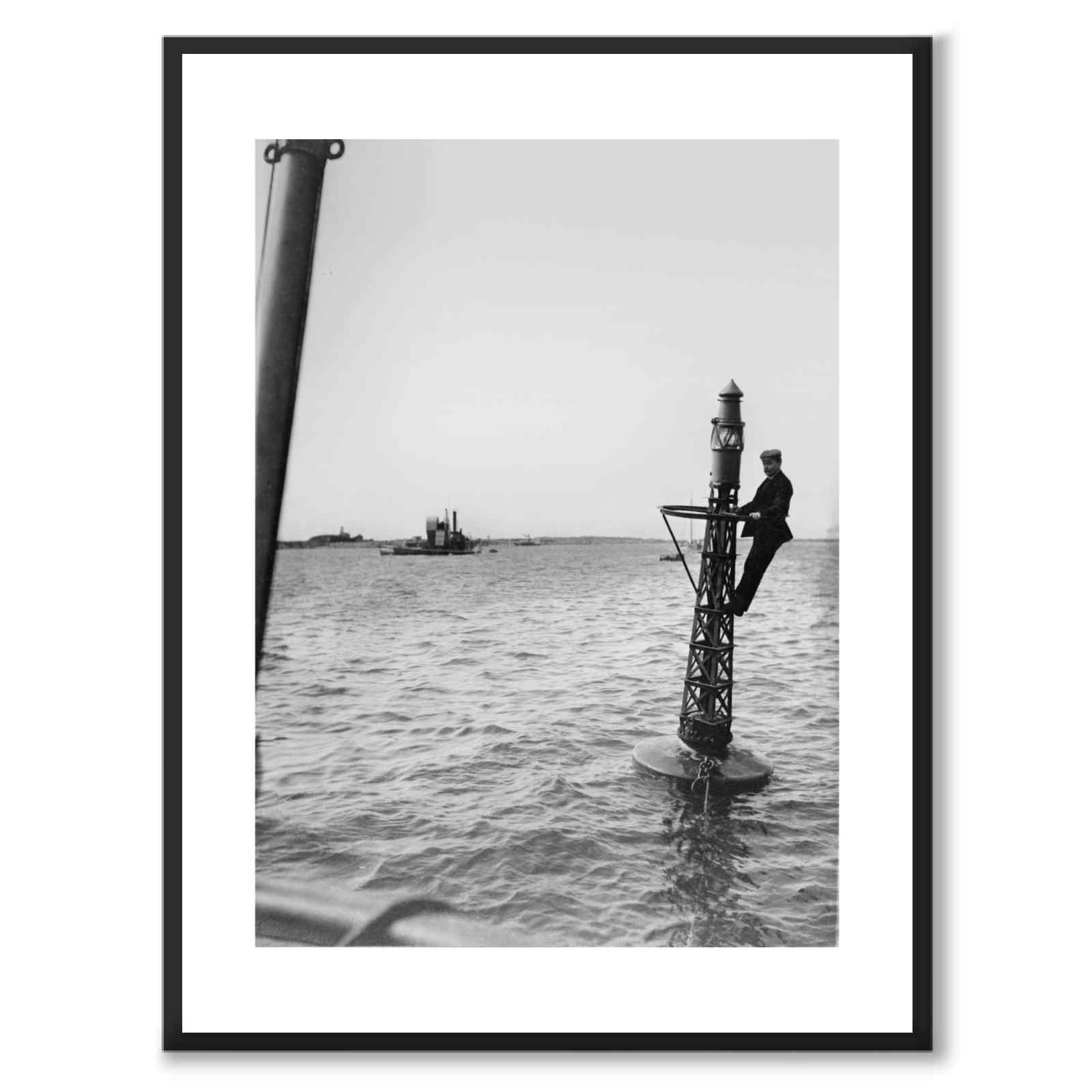 Plakat med motiv av en lysbøye ved Yttre Stengrund tidlig på 1900-tallet. En mann i dress og beret står på lysbøyen og undersøker den.