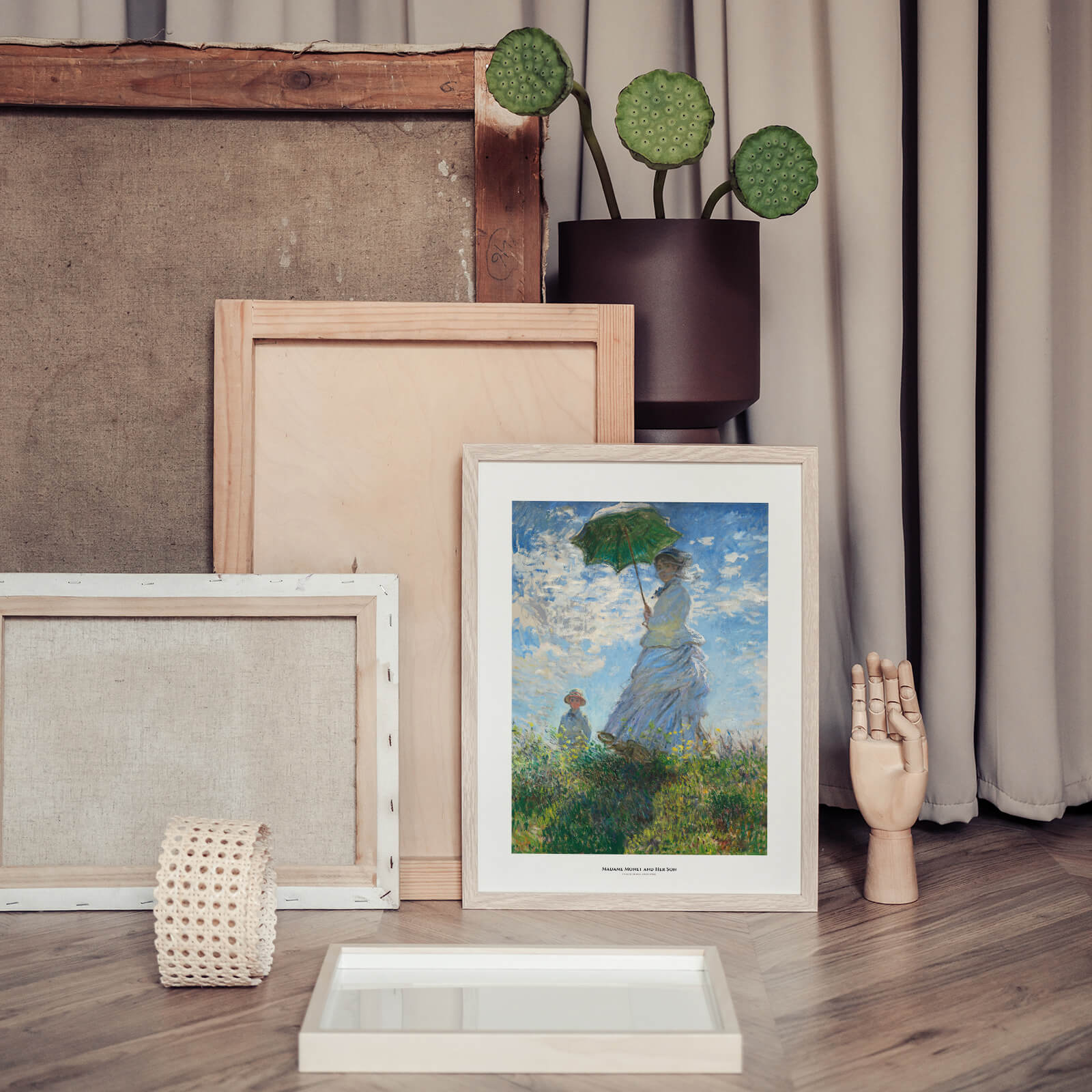Plakat med det fantastiske maleriet Woman With a Parasol - Madame Monet and Her Son fra 1875 av Claude Monet (1849-1926) som viser hans kone og sønn i en frodig sommereng utenfor Paris.
