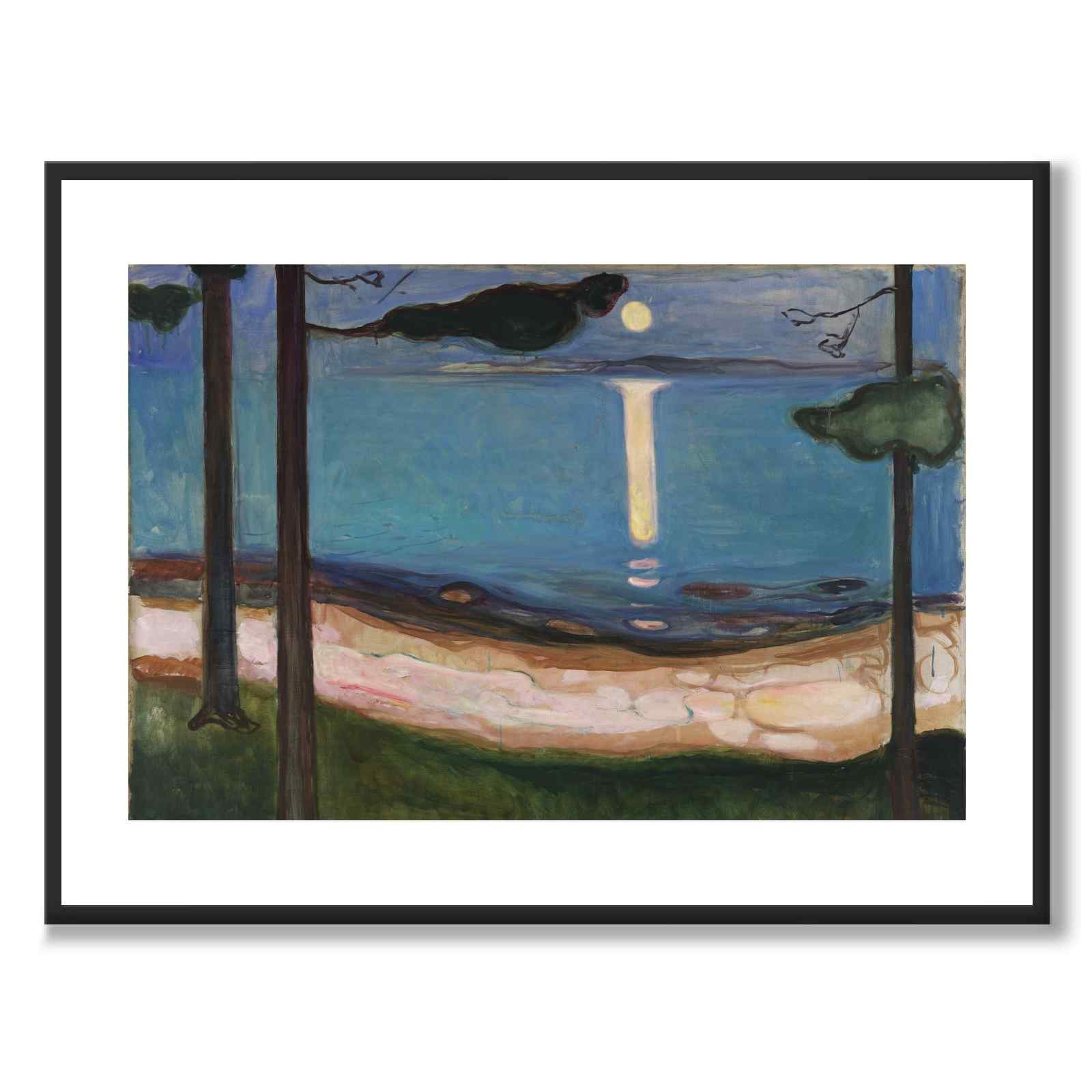 Maleriet forestiller en scene ved vannet der månen speiler seg i havoverflaten. Trærne på siden rammer inn landskapet, og Munch bruker sterke farger i rosa og blått.