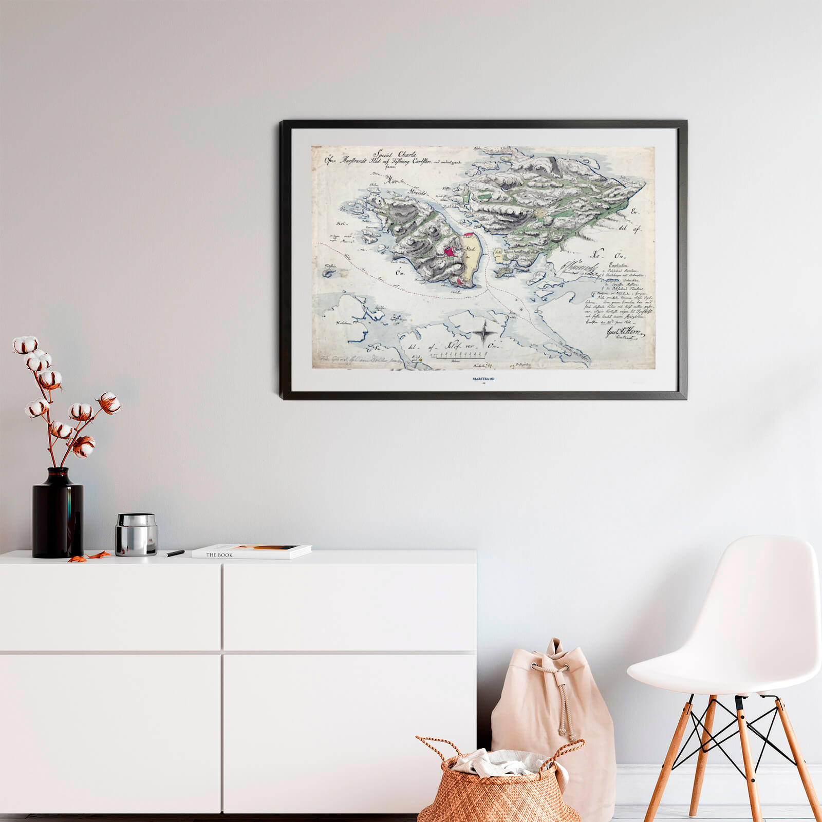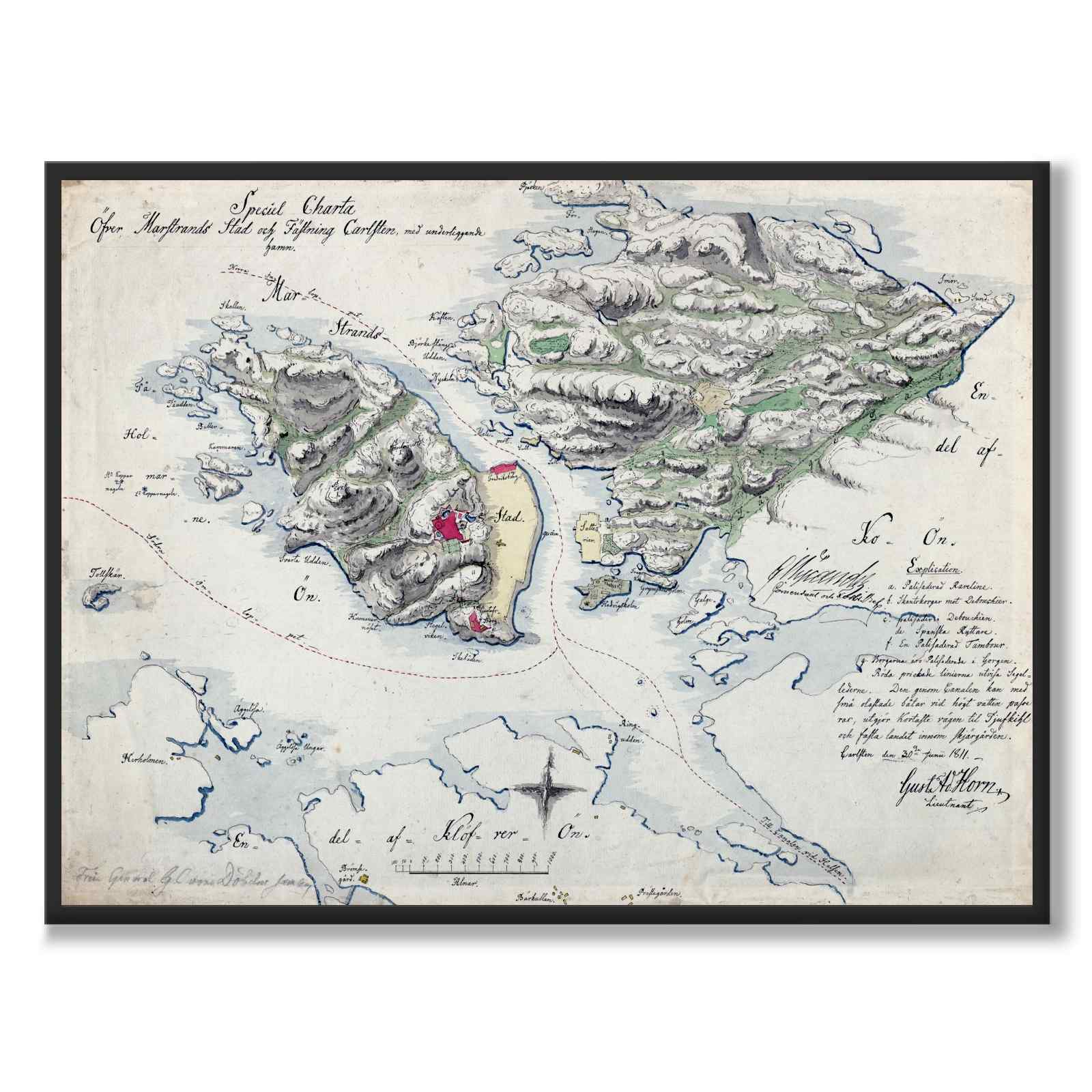 Plakat med gammelt kart over Marstrand i Bohuslän i 1811. I øvre venstre hjørne ser vi teksten Spesialbrev over Marstrands by og festning Carlsten, med underliggende havn. Kartet er tegnet av løytnant Gustaf Ad. Horn den 30. juni i 1811. En fantastisk illustrasjon av et av Sveriges mest elskede feriesteder på vestkysten.