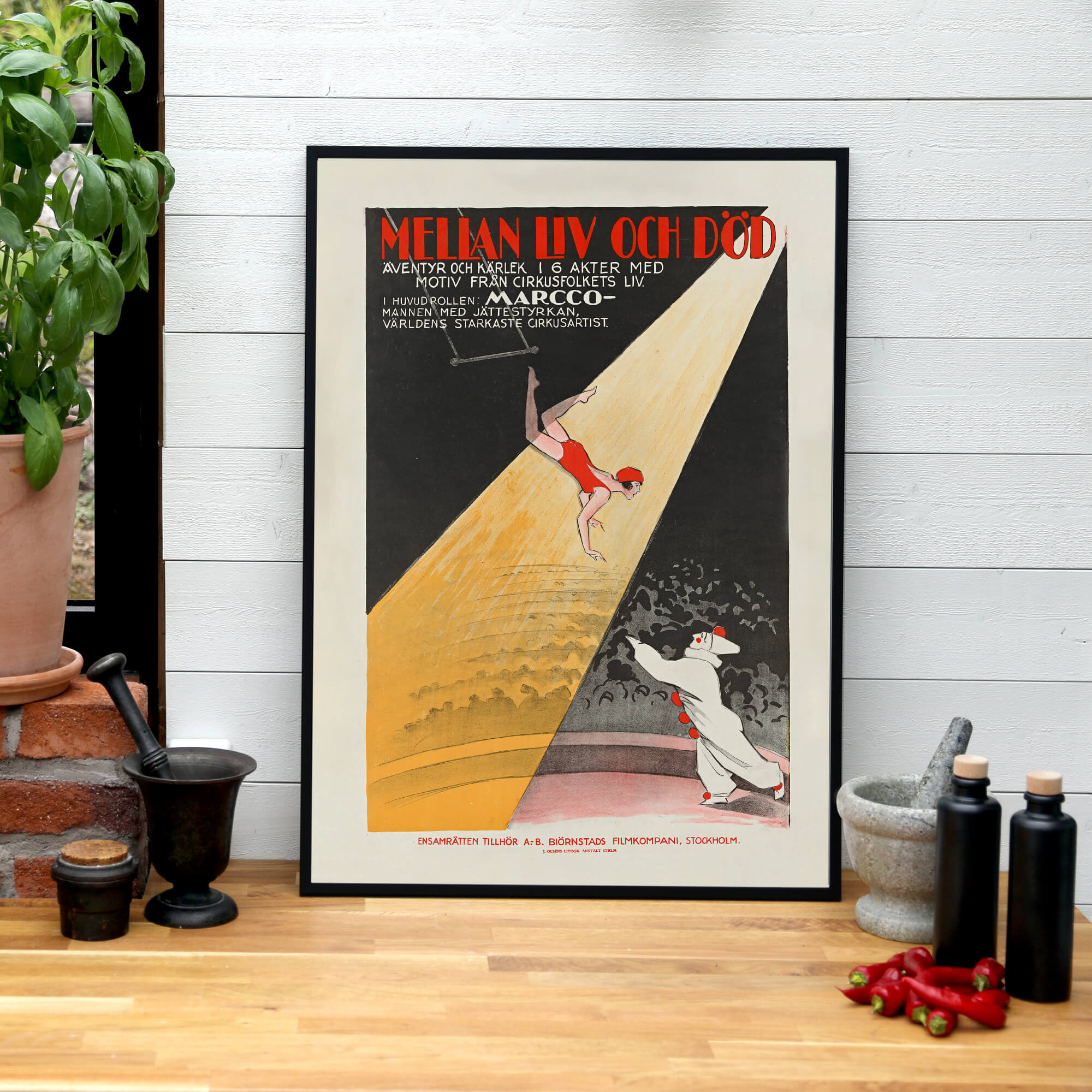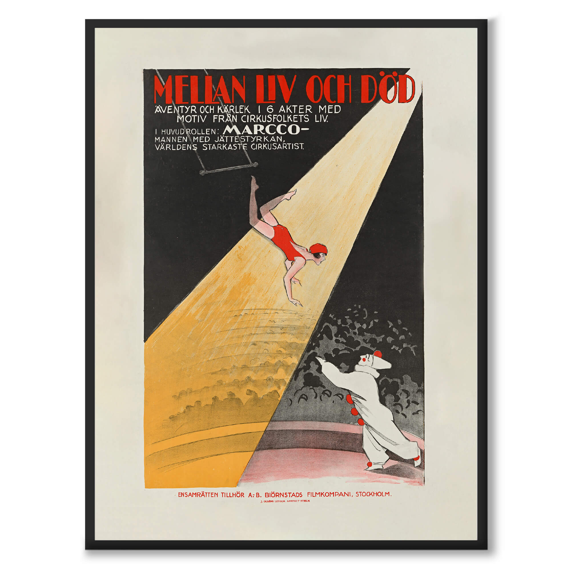 Sirkusplakat fra tidlig på 1900-tallet inspirert av den svenske dramafilmen Between Life and Death fra 1917. Les mer om filmen her .