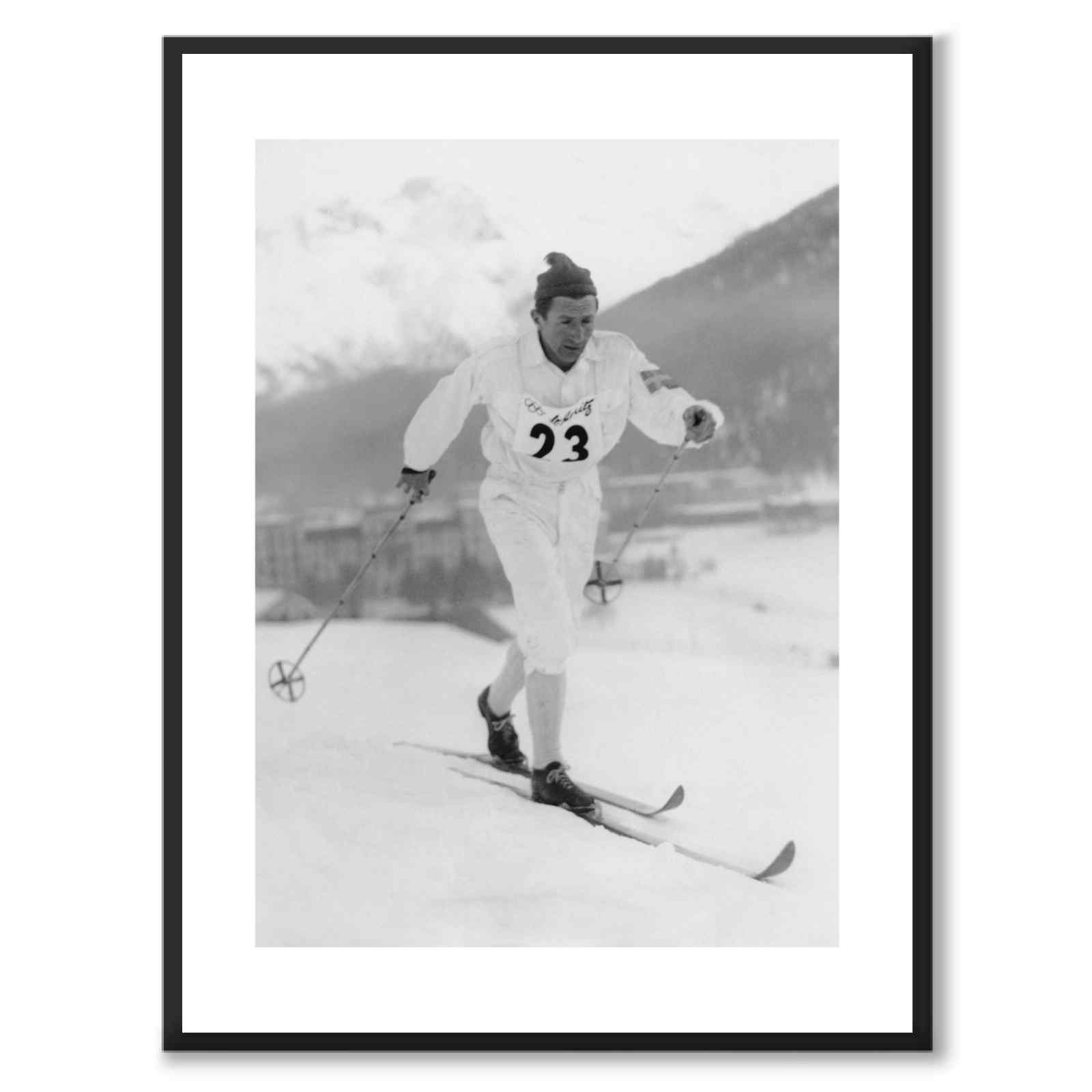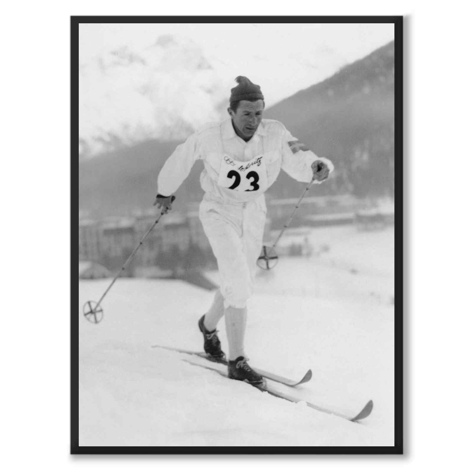 Plakat med bilde av skilegenden Mora-Nisse som vant gullmedaljen på femmilen under de olympiske vinterlekene i St. Moritz, Sveits i 1948.