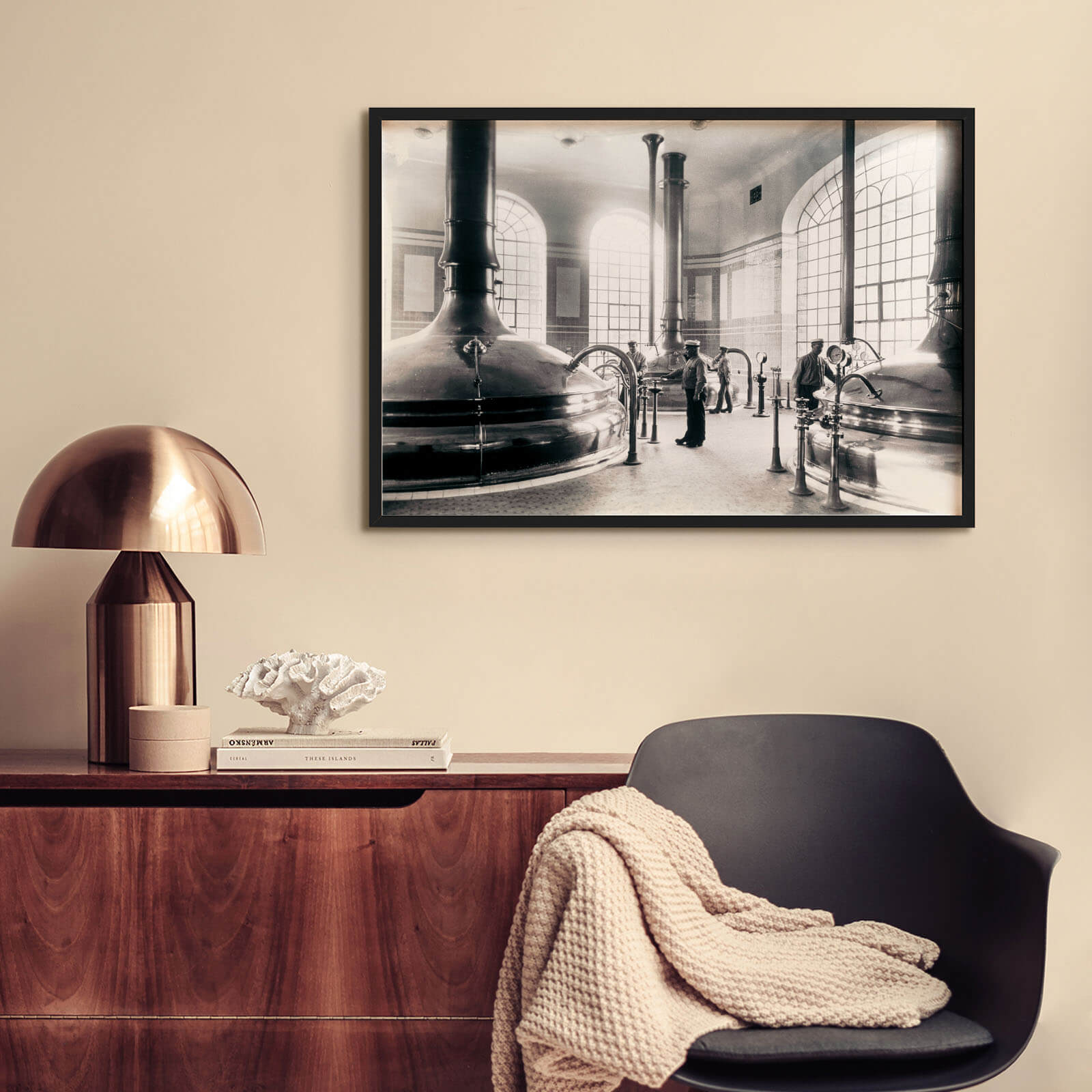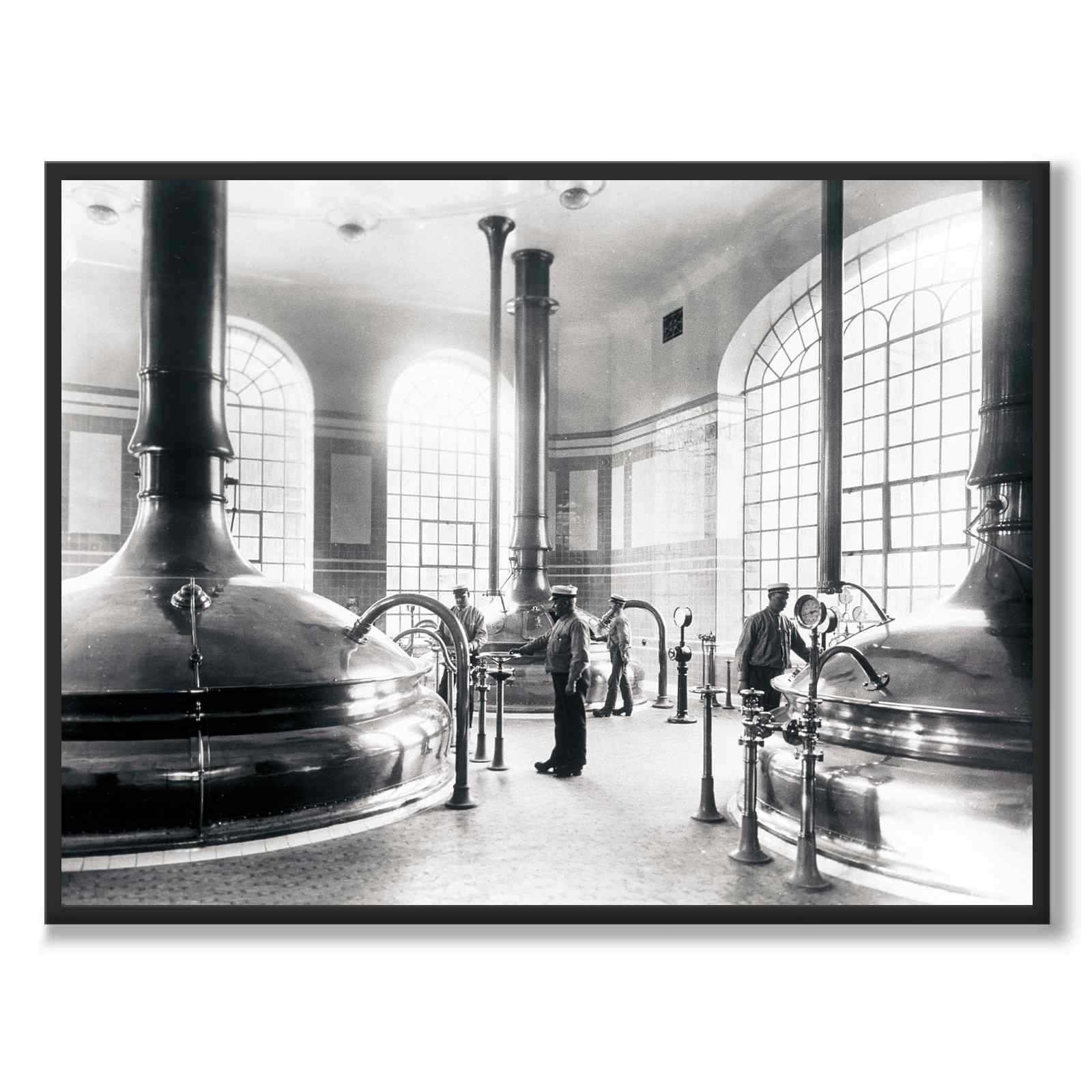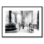 Plakat med bilde fra innsiden av Münchenbryggeriet i Stockholm. Bryggeriet startet ølproduksjonen i 1857 og den fortsatte til 1971 da produksjonen ble flyttet til Pripps nye bryggeri i Bromma. De store kobbergjærerne var datidens mest moderne.