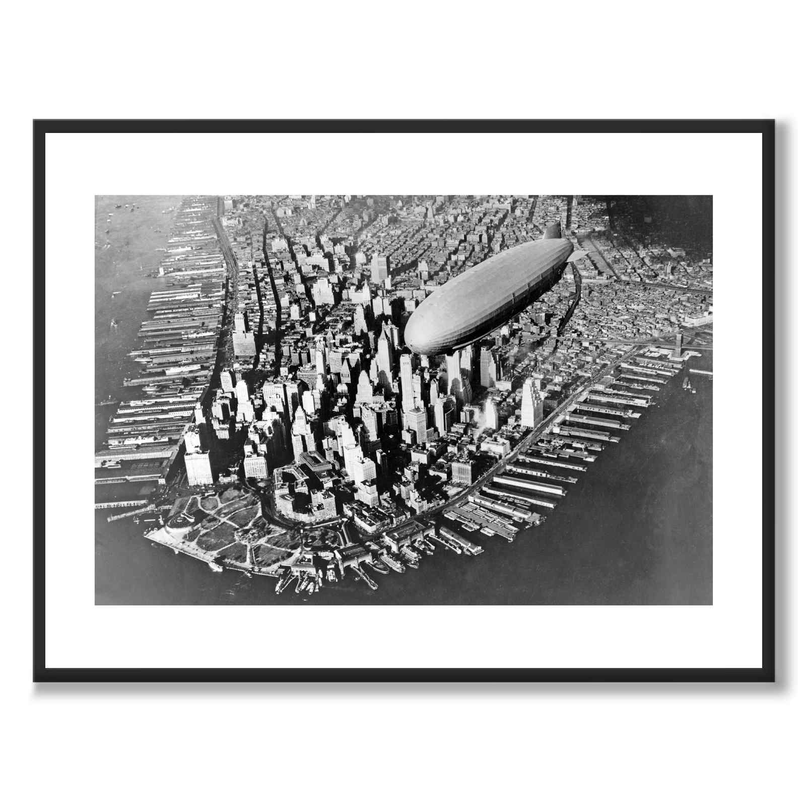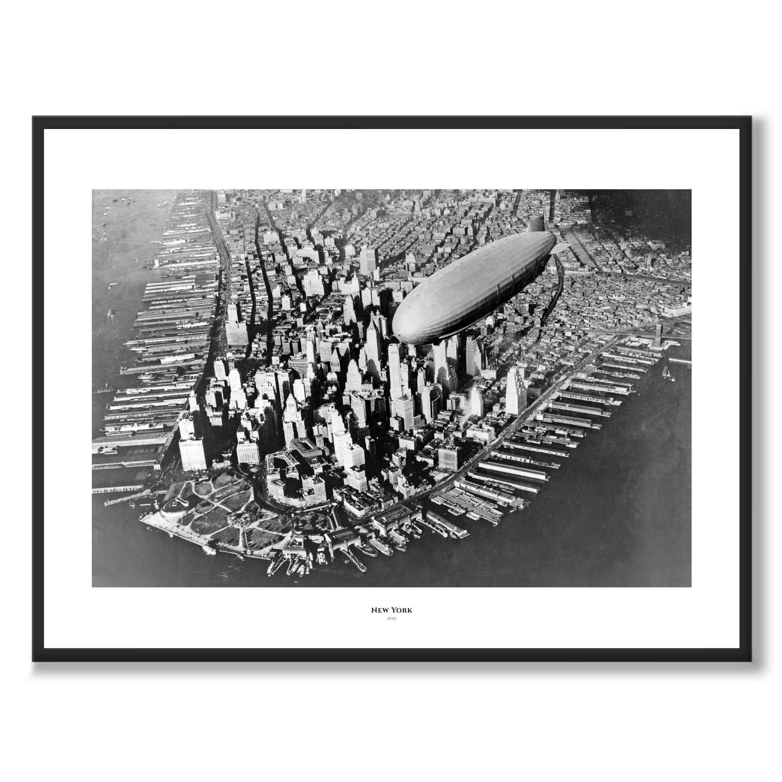 Plakat med luftfoto av Manhattan, New York på 1930-tallet. I den øvre delen av bildet ser vi en type luftskip kalt en zeppelin.