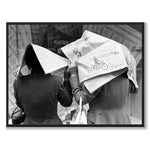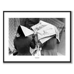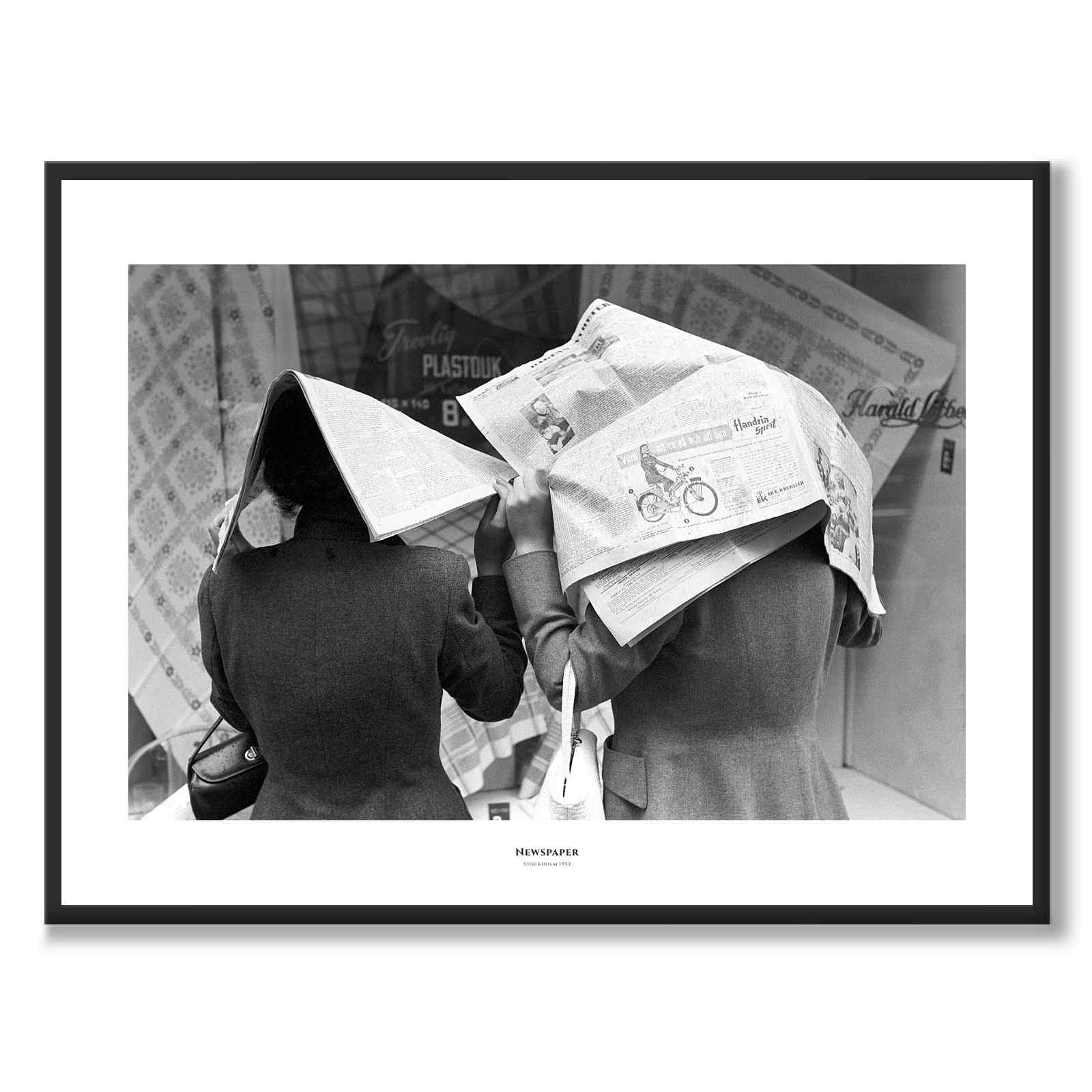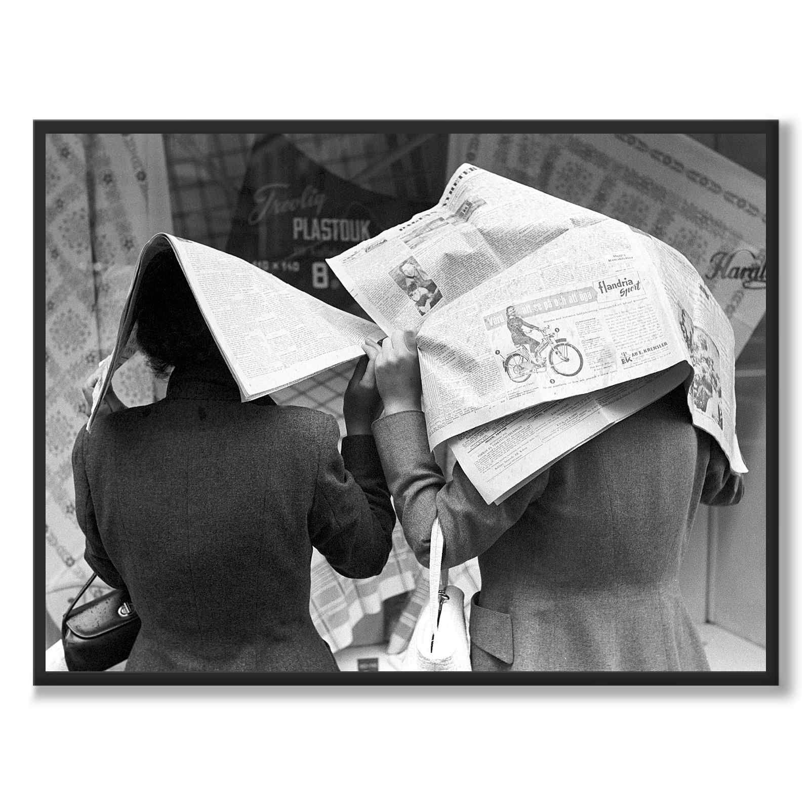 Plakat med et øyeblikksbilde av Stockholm på 1950-tallet. Det er en regnværsdag og to kvinner prøver å unngå å bli våte ved å holde aviser over dem. En annonse er godt synlig for den belgiske mopeden Flandria Sport. Året er 1953.