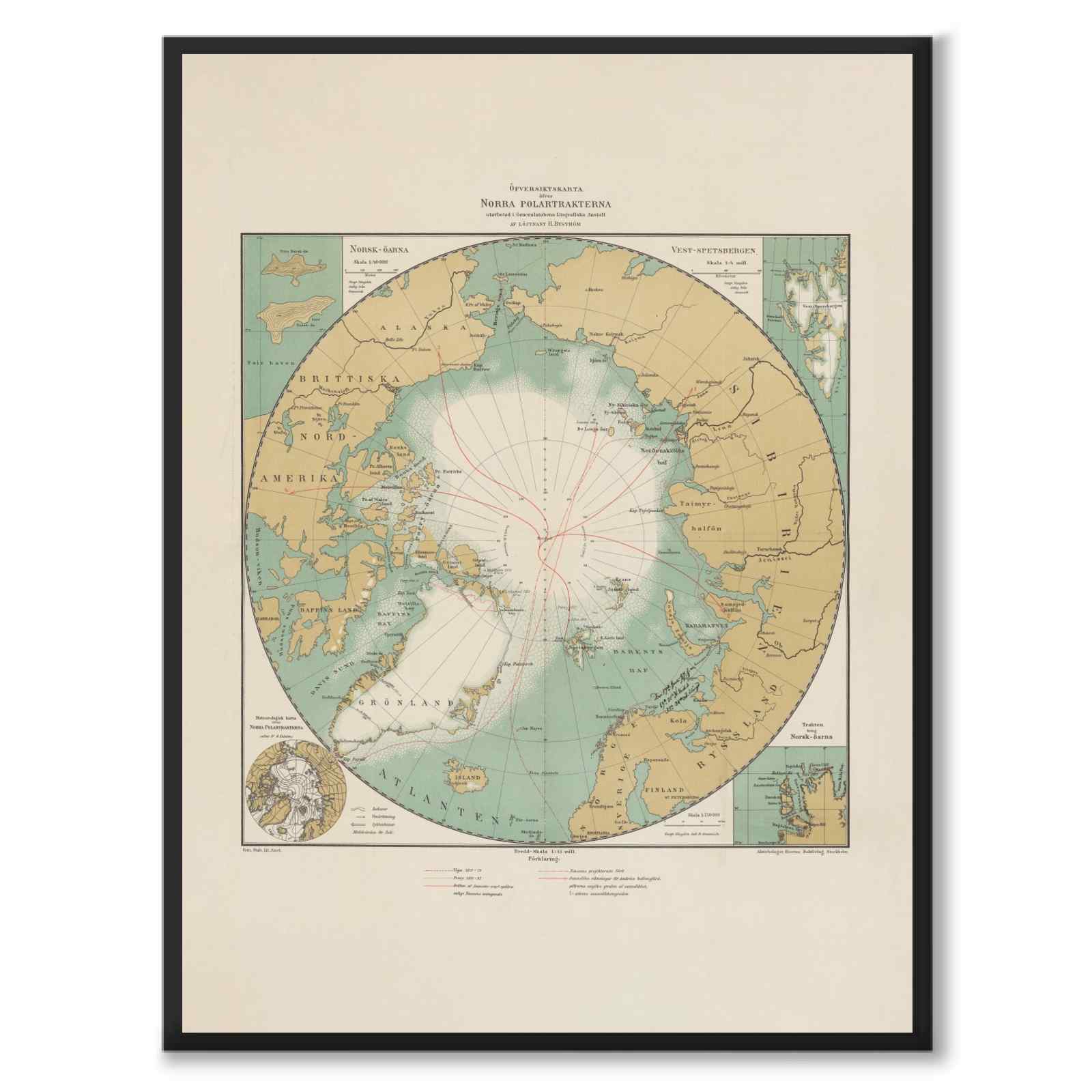 Plakat med et gammelt kart over Nordpolen fra 1896. Øverst på bildet ser vi teksten: "Öfversiktskarta öfver norra polartrakterna : utarbetad i Generalstabens litografiska anstalt af löjtnant H. Byström." - hvor vi ser at kartet er laget av løytnant Herman B yström.