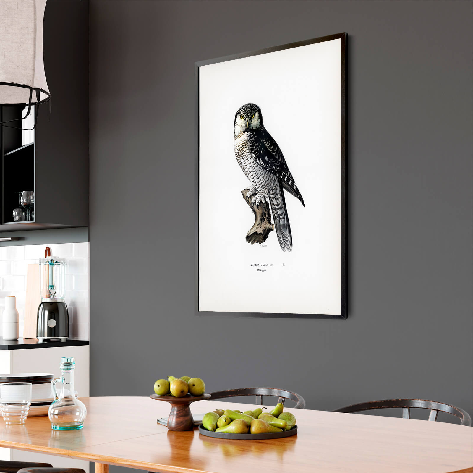 Plakat med en gammel illustrasjon av en haukugle . Illustrasjonen er tegnet av brødrene von Wright og utgitt på begynnelsen av 1900-tallet i boken Swedish Birds After Nature Och På Sten Ritad . På bildet ser vi blant annet teksten Surnia Ulula - latin for navnet på arten .