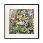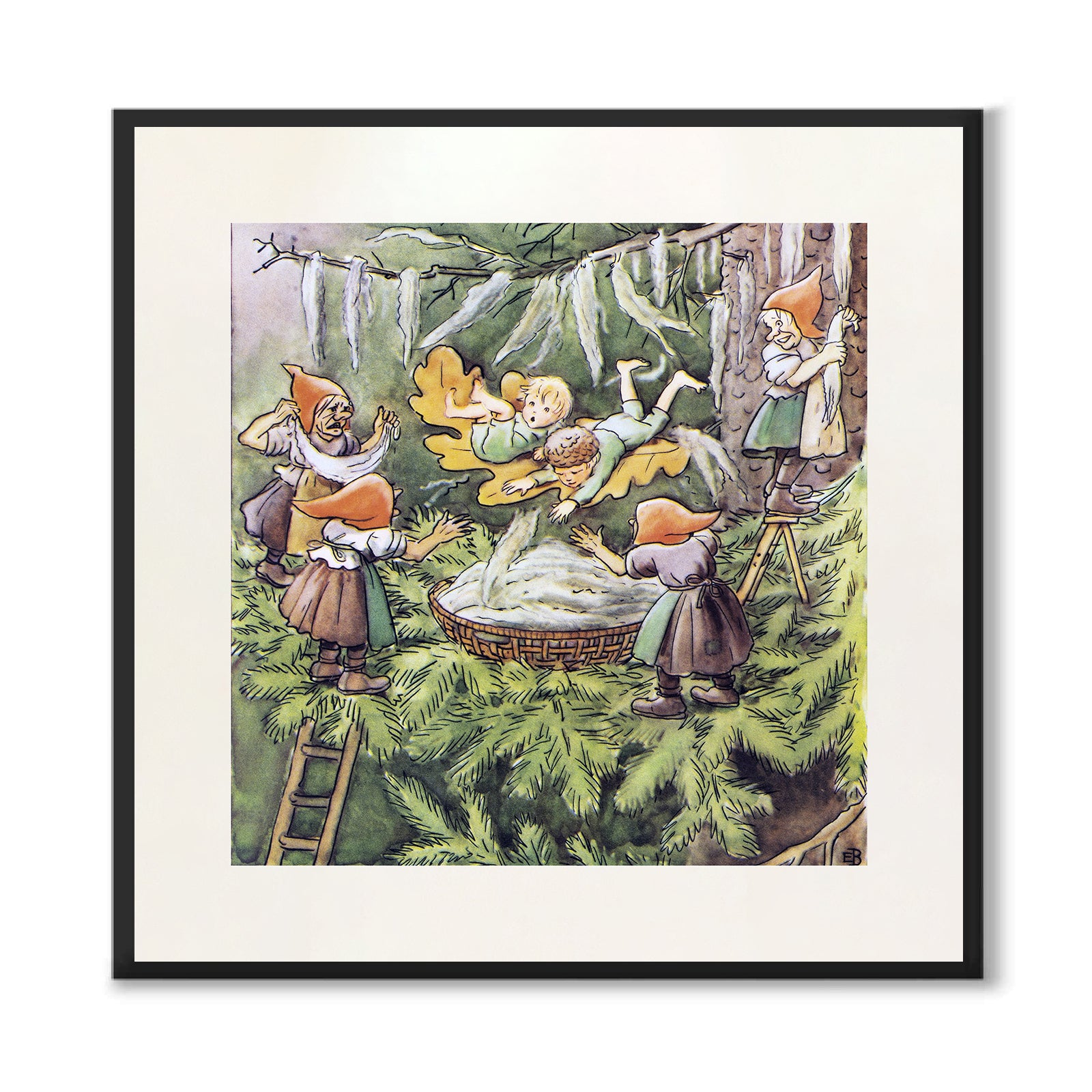 I denne illustrasjonen ser vi små alver som prøver å ta imot Ocke og Pillerill som kommer flyvende på et løv i skogen mens de henger strimler av skjeggetemose.