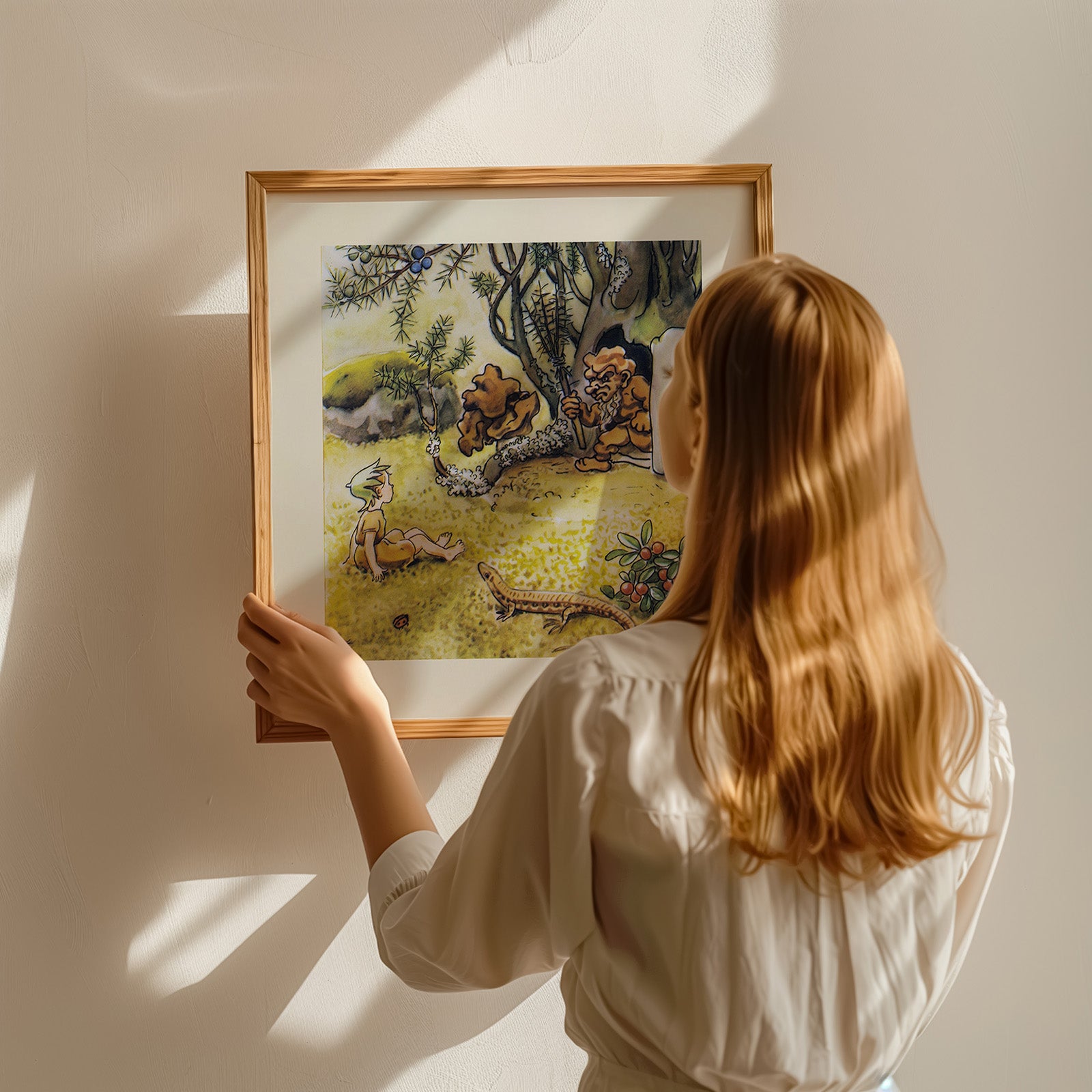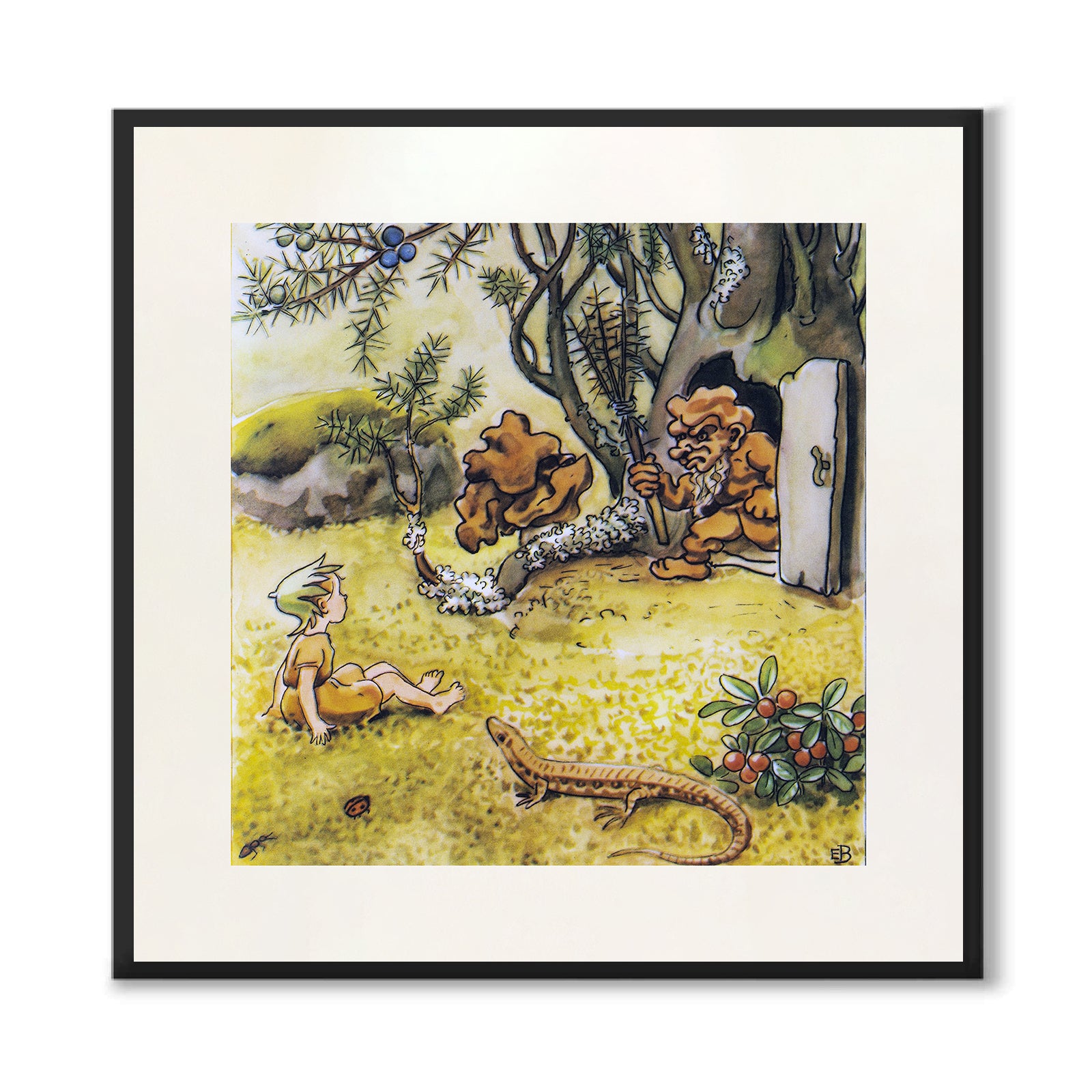 I denne illustrasjonen ser vi hasseljenta Nutta som ser ut til å ha møtt et sint troll. Trollet er på vei ut av hjemmet sitt med en høygaffel laget av kvister og nåler i høygir. I scenen ser vi også en øgle og en liten tyttebærbusk på høyre side.