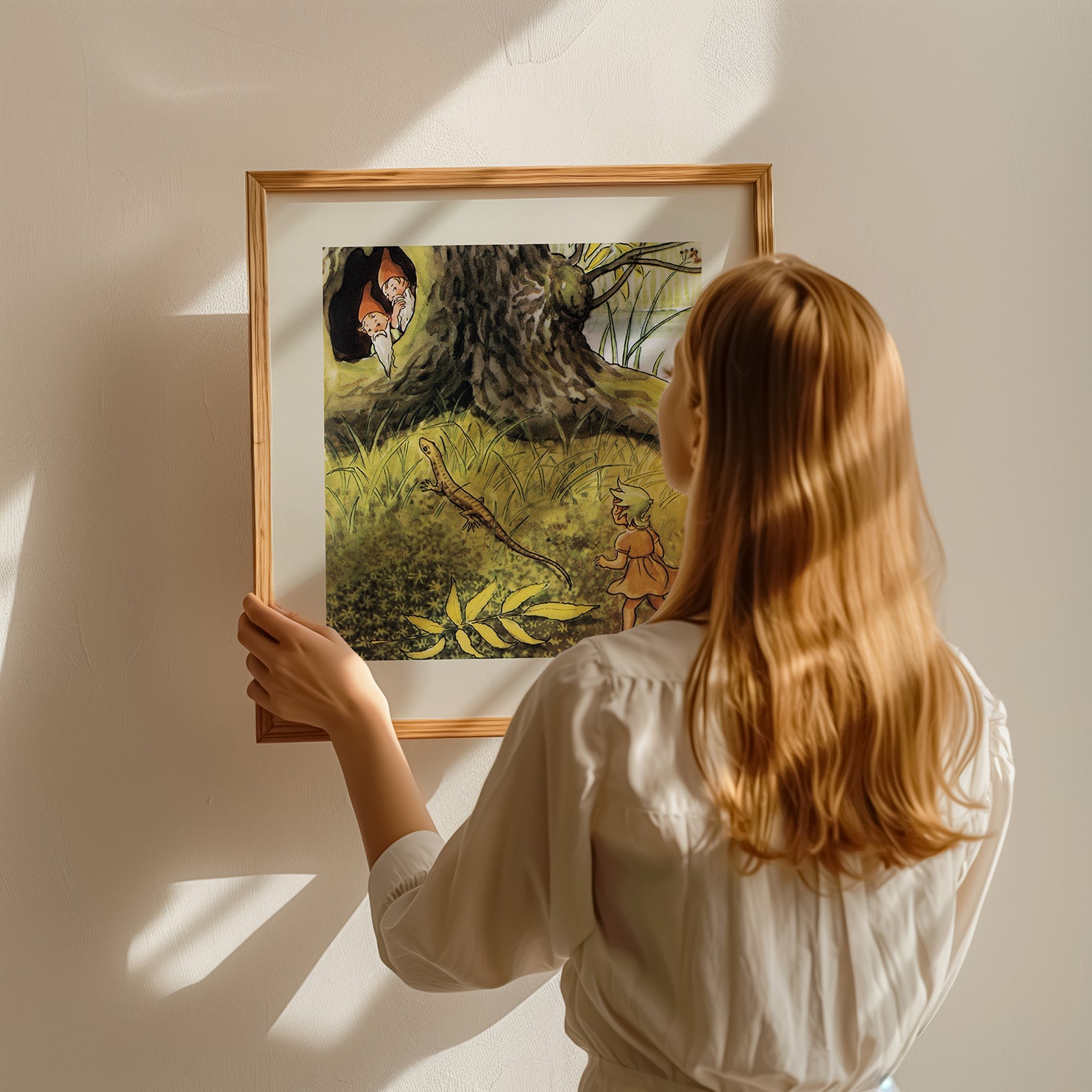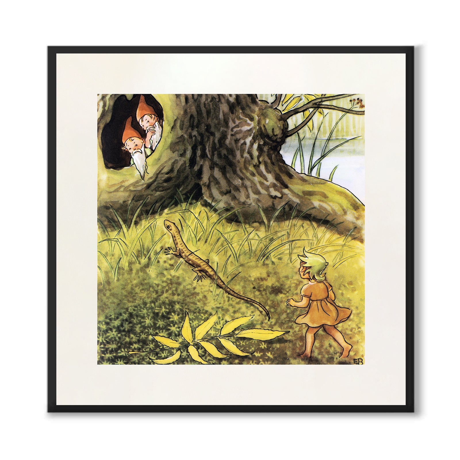 I denne illustrasjonen ser vi hasselnøttjenta Nutta som har oppdaget to alver. Foran henne ser vi øglen som ser ut til å være en følgesvenn på Nuttas eventyr.