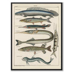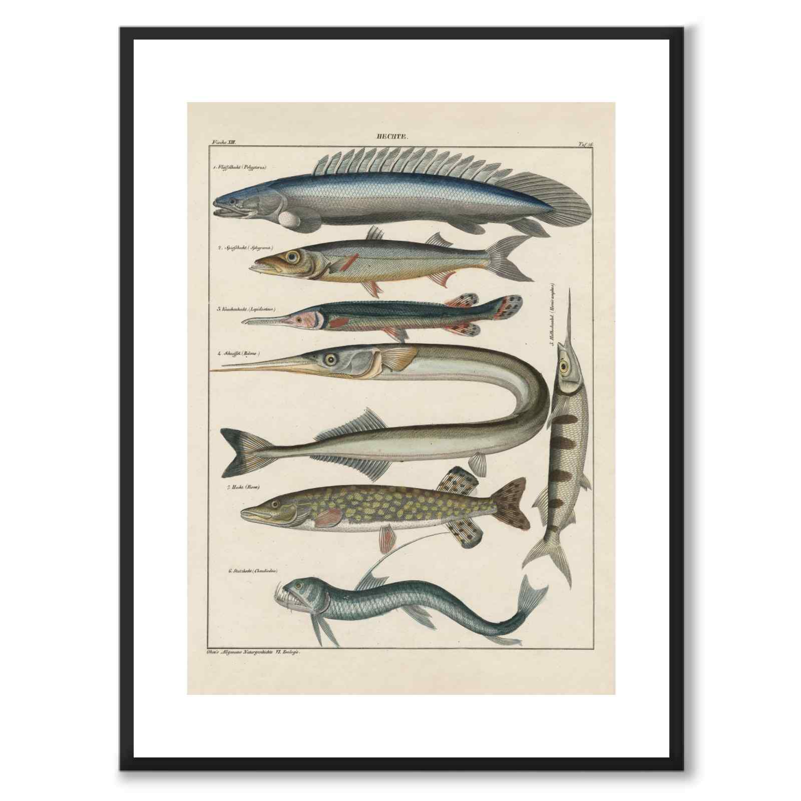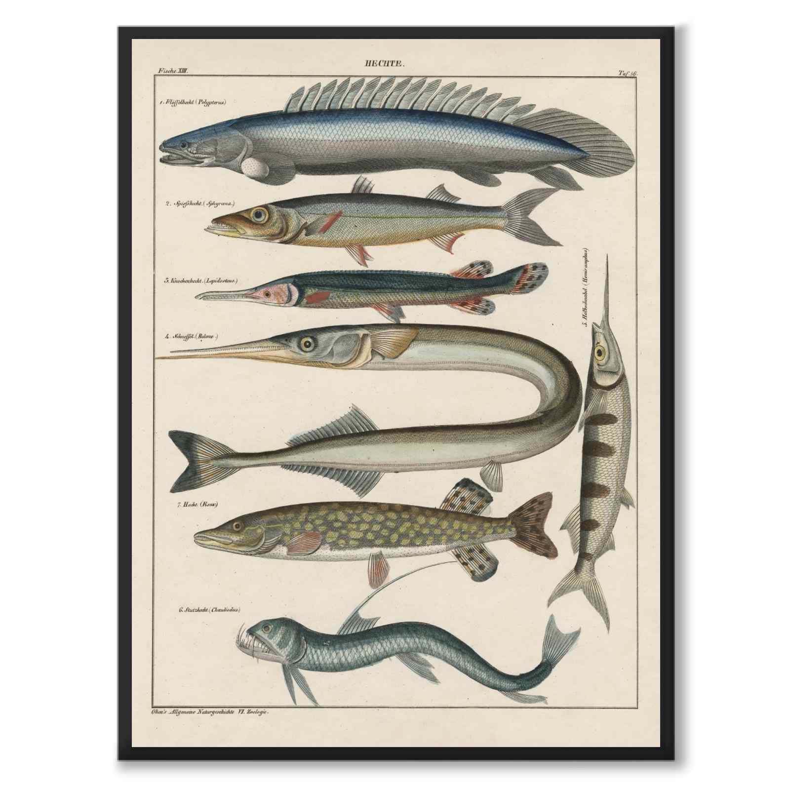 Plakat med en gammeldags vitenskapelig illustrasjon Oken Naturalia laget av den tyske naturforskeren Lorenz Oken. Øverst på bildet står ordet Hecht som er tysk og betyr "gjedder". Nedenfor ser vi flere forskjellige typer gjedder.