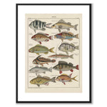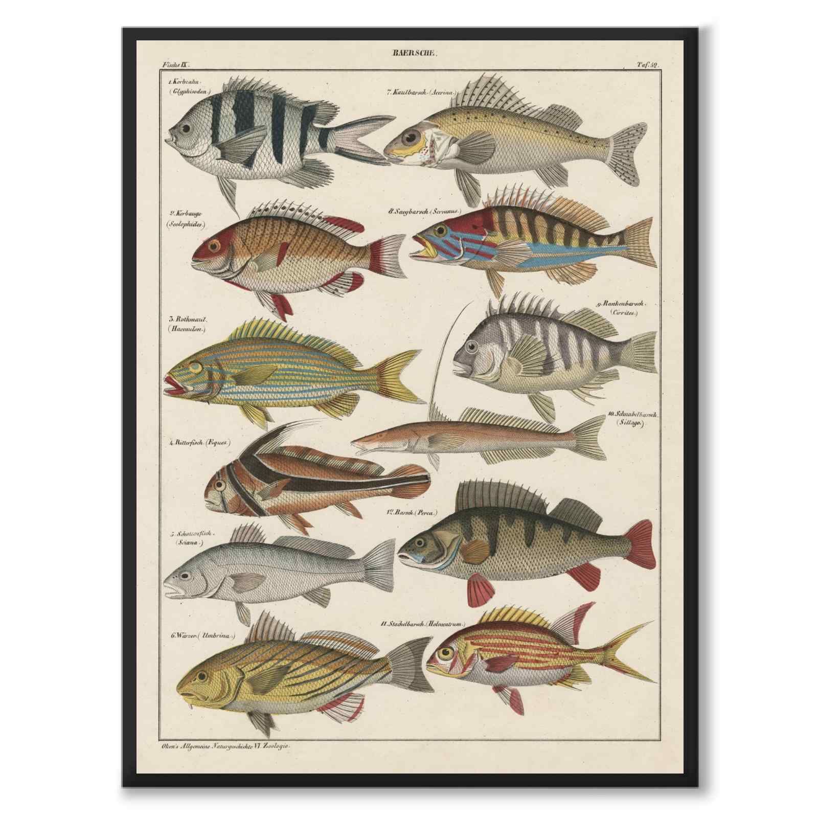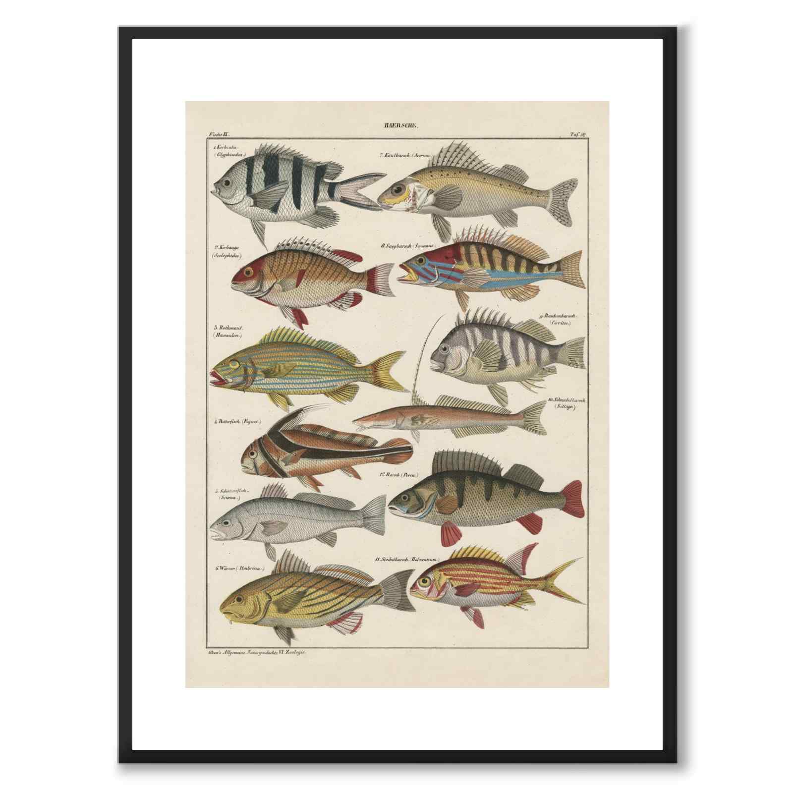 Plakat med en gammeldags vitenskapelig illustrasjon Oken Naturalia laget av den tyske naturforskeren Lorenz Oken. Øverst på bildet står ordet Øl som er tysk og betyr "abborfisk". Nedenfor ser vi flere ulike typer abbor.