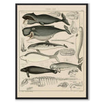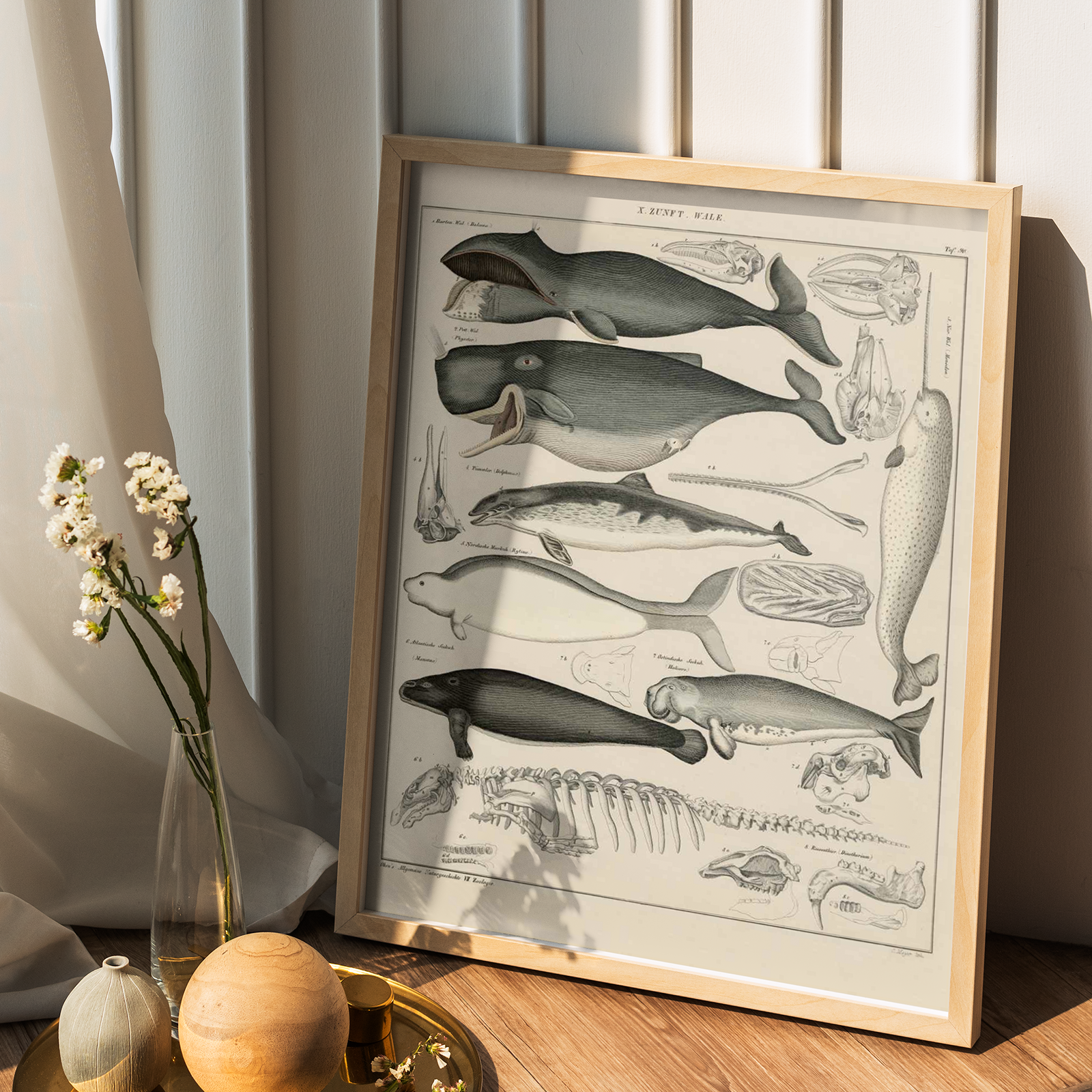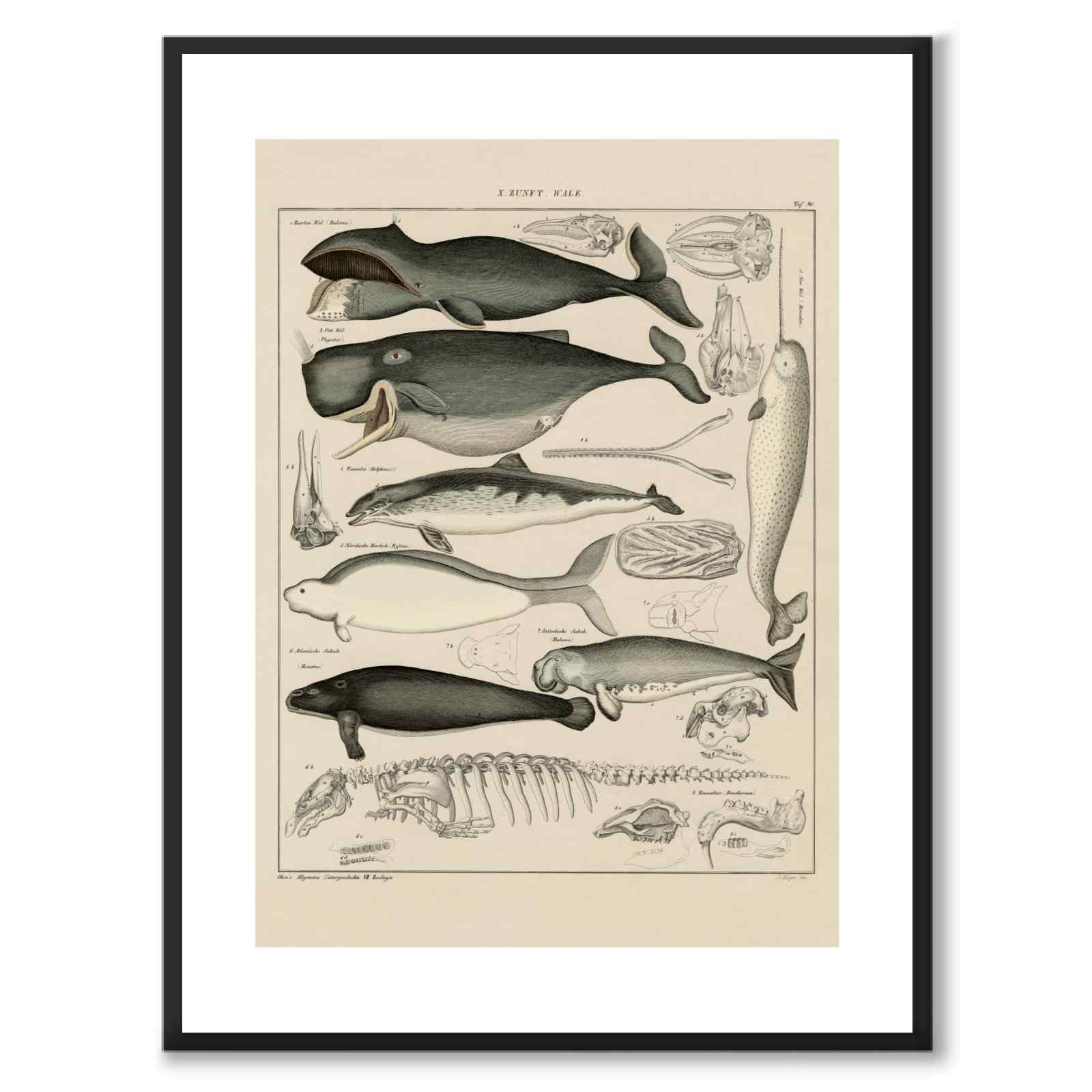 Plakat med en gammeldags vitenskapelig illustrasjon Oken Naturalia laget av den tyske naturforskeren Lorenz Oken. Øverst på bildet står ordet X. ZUNFT. WALE som er tysk og betyr "tiende seksjon: Hvaler". Nedenfor ser vi flere forskjellige typer hvaler, inkludert en spermhval.