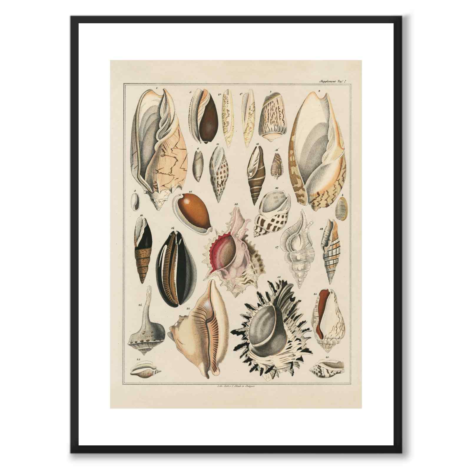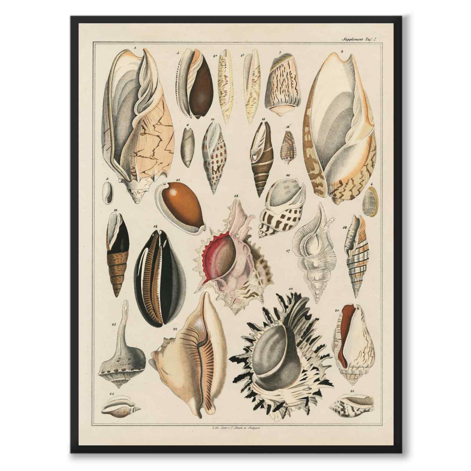 Plakat med en klassisk vitenskapelig illustrasjon Ok Naturalia skapt av den tyske forskeren Lorenz Oken. På bildet ser vi forskjellige typer vakre skjell.