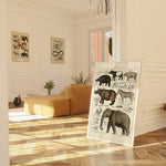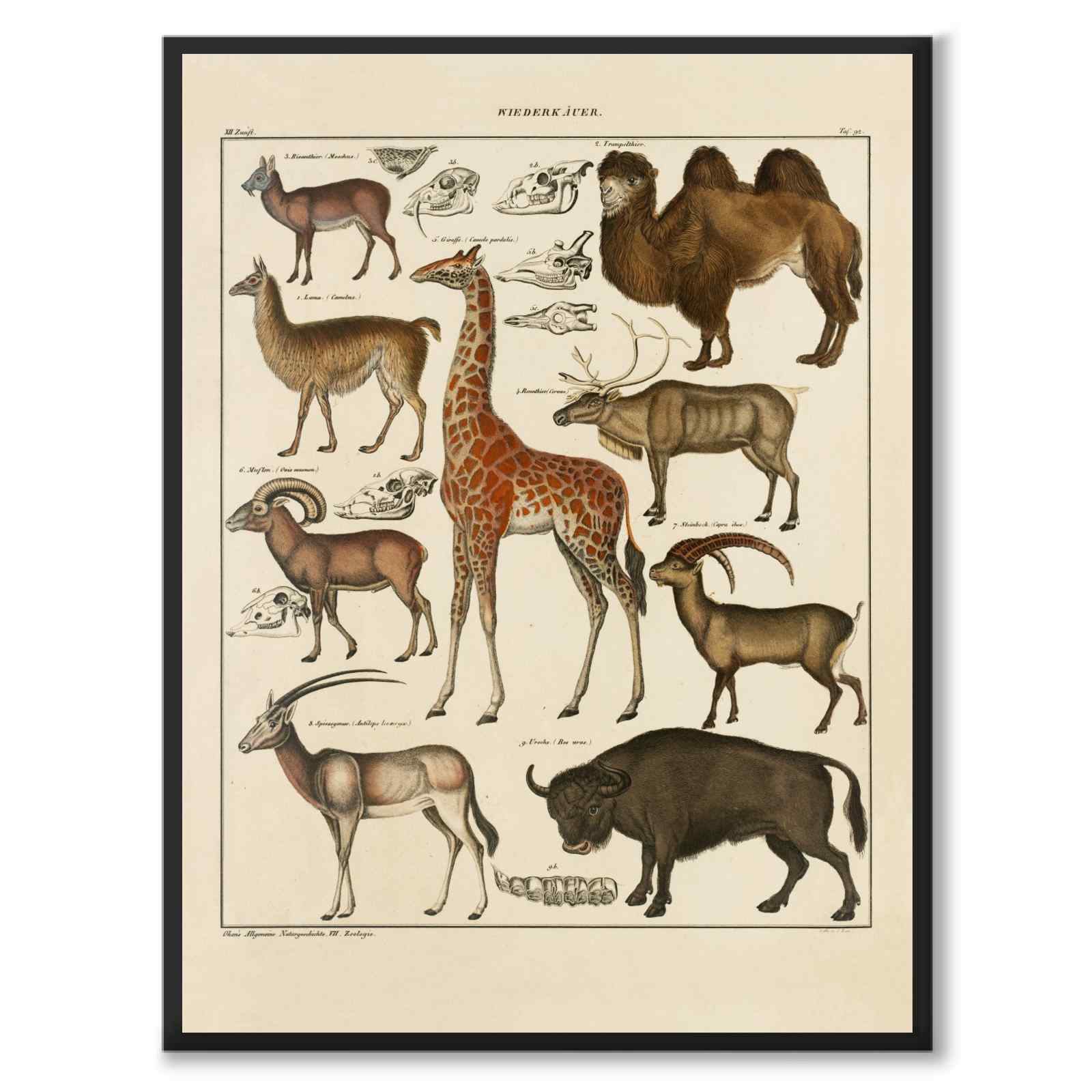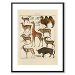 Plakat med en gammeldags vitenskapelig illustrasjon Oken Naturalia laget av den tyske naturforskeren Lorenz Oken. På bildet ser vi flere forskjellige typer dyr, for eksempel en sjiraff, bisonox, lama, rein og kamel.