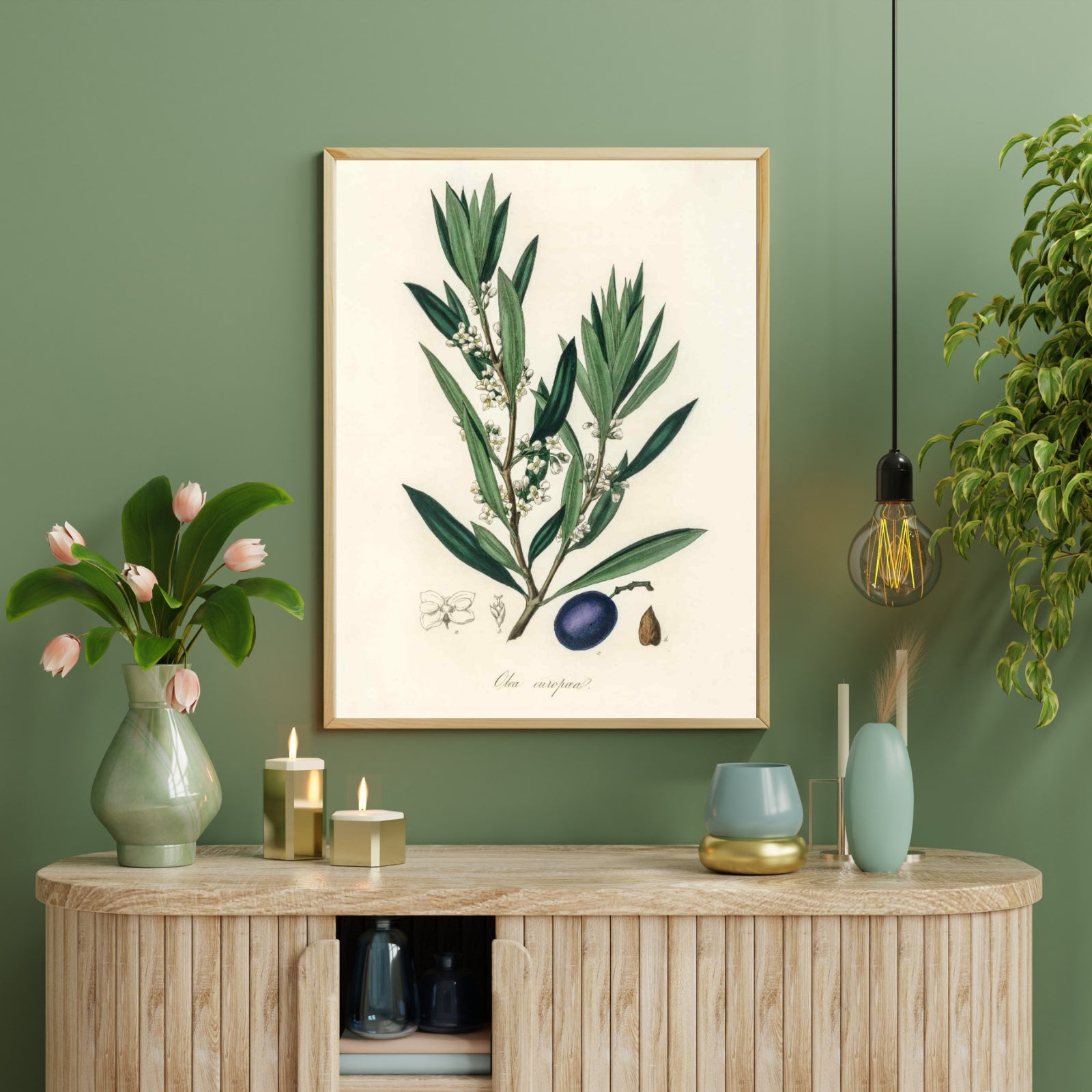 Plakat med en botanisk illustrasjon av en olivengren fra 1800-tallet . Olea europaea , bedre kjent som oliventreet, er en ikonisk og allsidig plante med dype røtter i middelhavskulturen og historien.