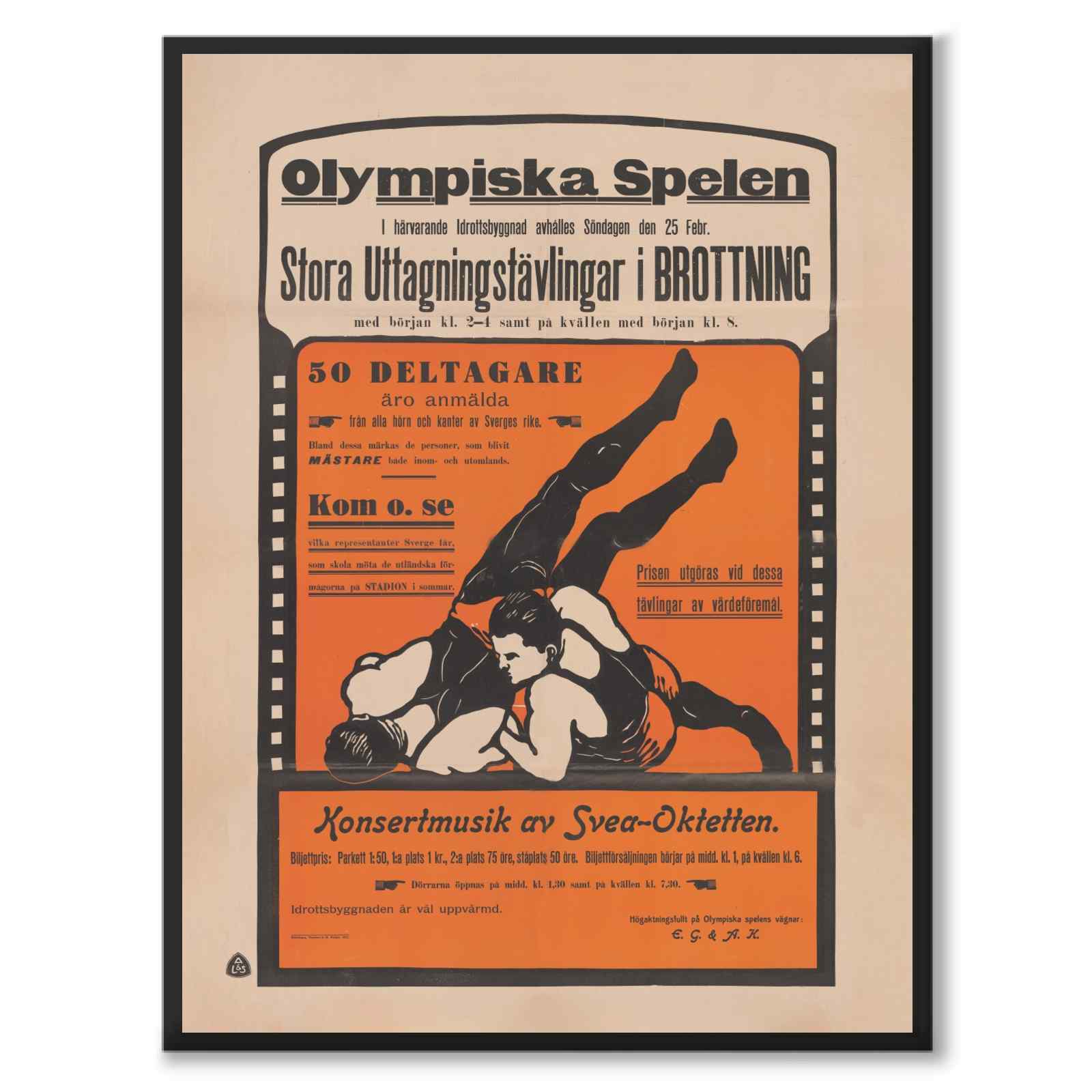 Plakat med en vintage-illustrert plakat for de olympiske leker i Stockholm i 1912. Plakaten viser blant annet at det holdes store utvalgskonkurranser i bryting hvor 50 deltakere er påmeldt «fra alle kanter og kanter av Sveriges rike».