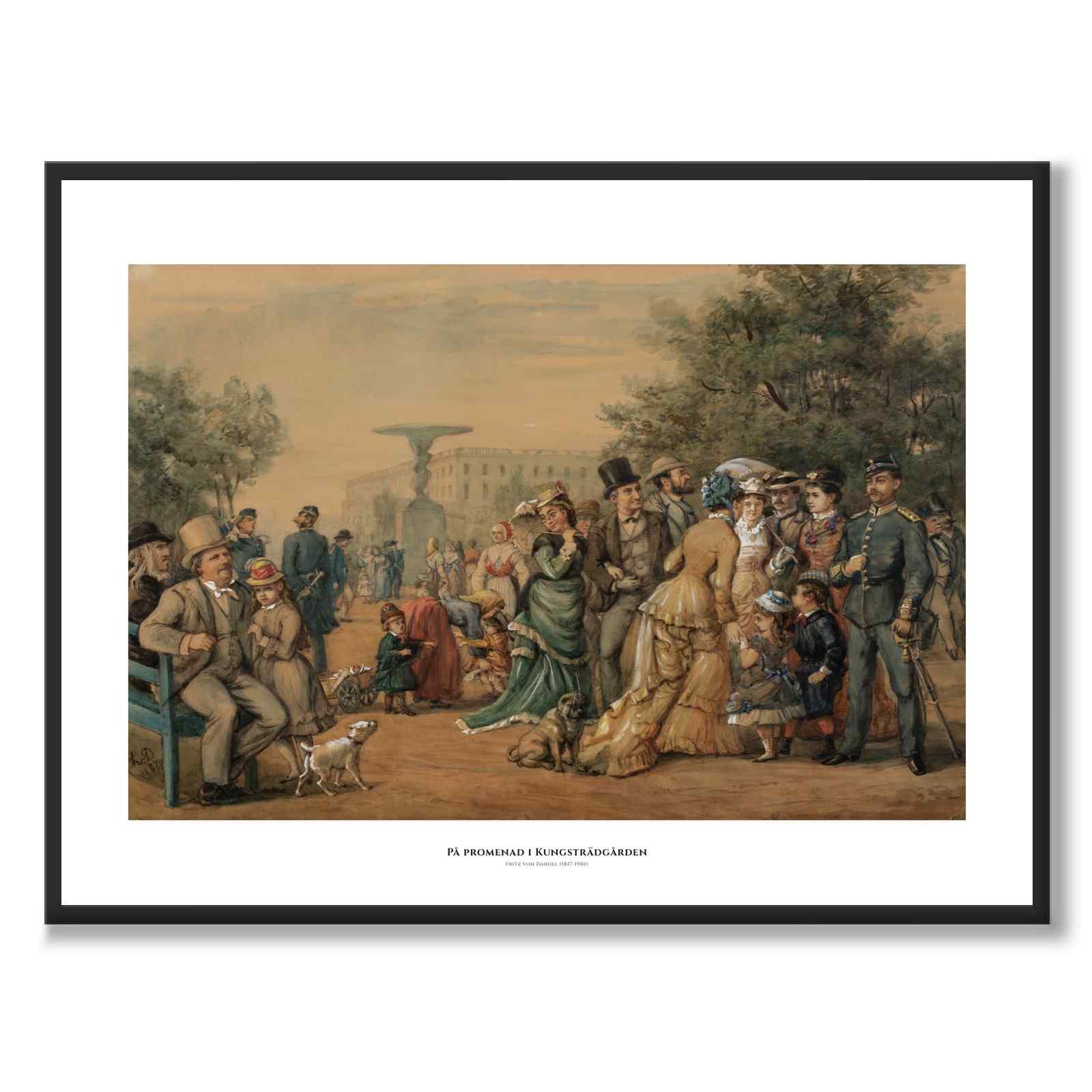 Maleriet viser mennesker som går gjennom Kungsträdgården i Stockholm på 1800-tallet. Scenen skildrer elegante byfolk i tidstypiske klær, fanget i et hverdagslig, men livlig øyeblikk. Von Dardel trekker frem både miljøet og stemningen i parken, hvor rolige turer og sosialt samvær var sentralt.