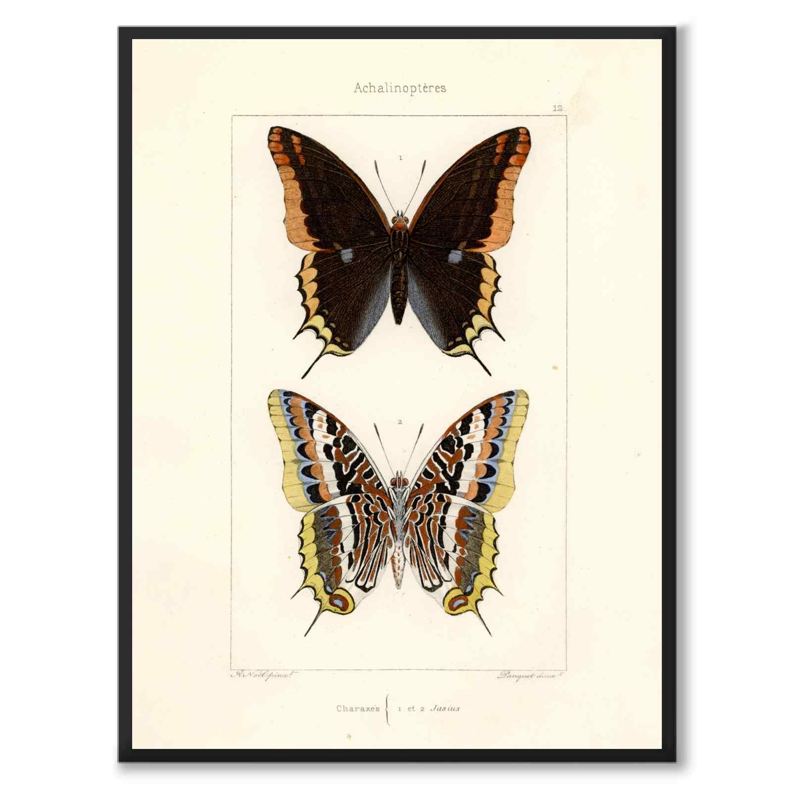 Denne illustrasjonen viser to sommerfugler fra familien Achalinopteres. Sommerfuglene har store vinger, og den nederste sommerfuglen har mange forskjellige nyanser av fargene gul, blå og rød.