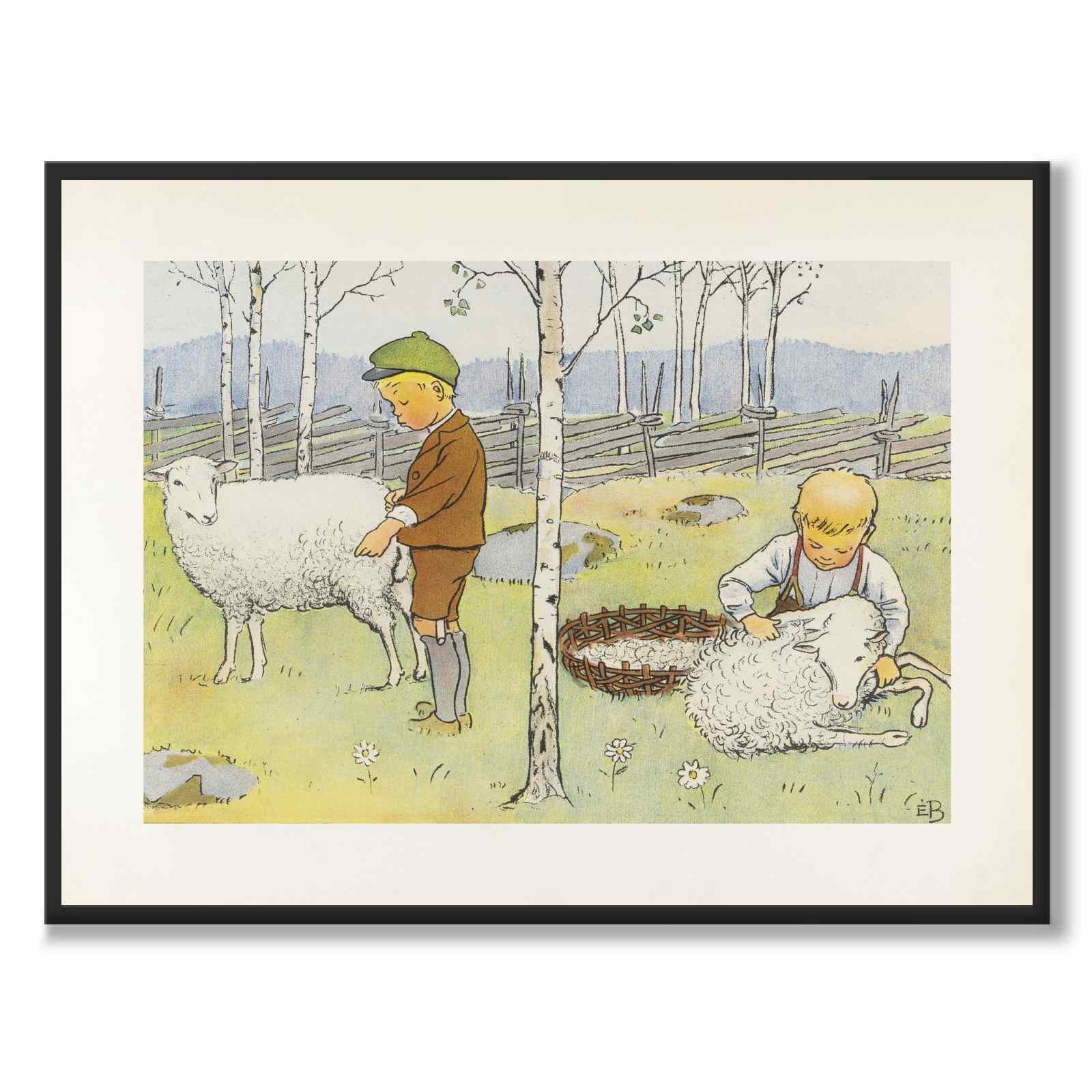 Bildet viser to unge gutter som er ute på landet, omgitt av trær og et gjerde. Den ene gutten står ved en sau mens den andre gutten sitter på bakken og klemmer et lam. Guttene er kledd i landtøy hvor barna er i nærkontakt med dyrene.