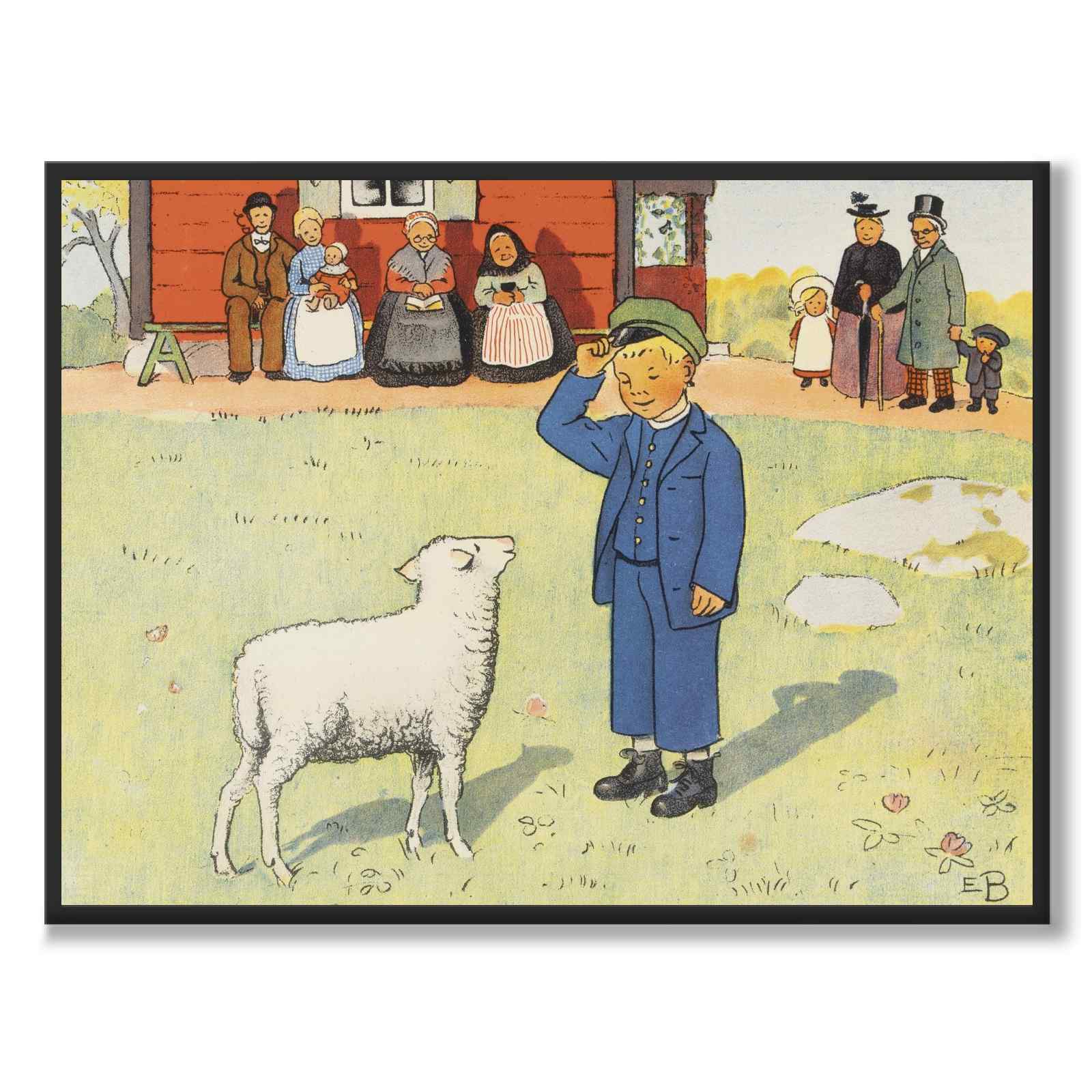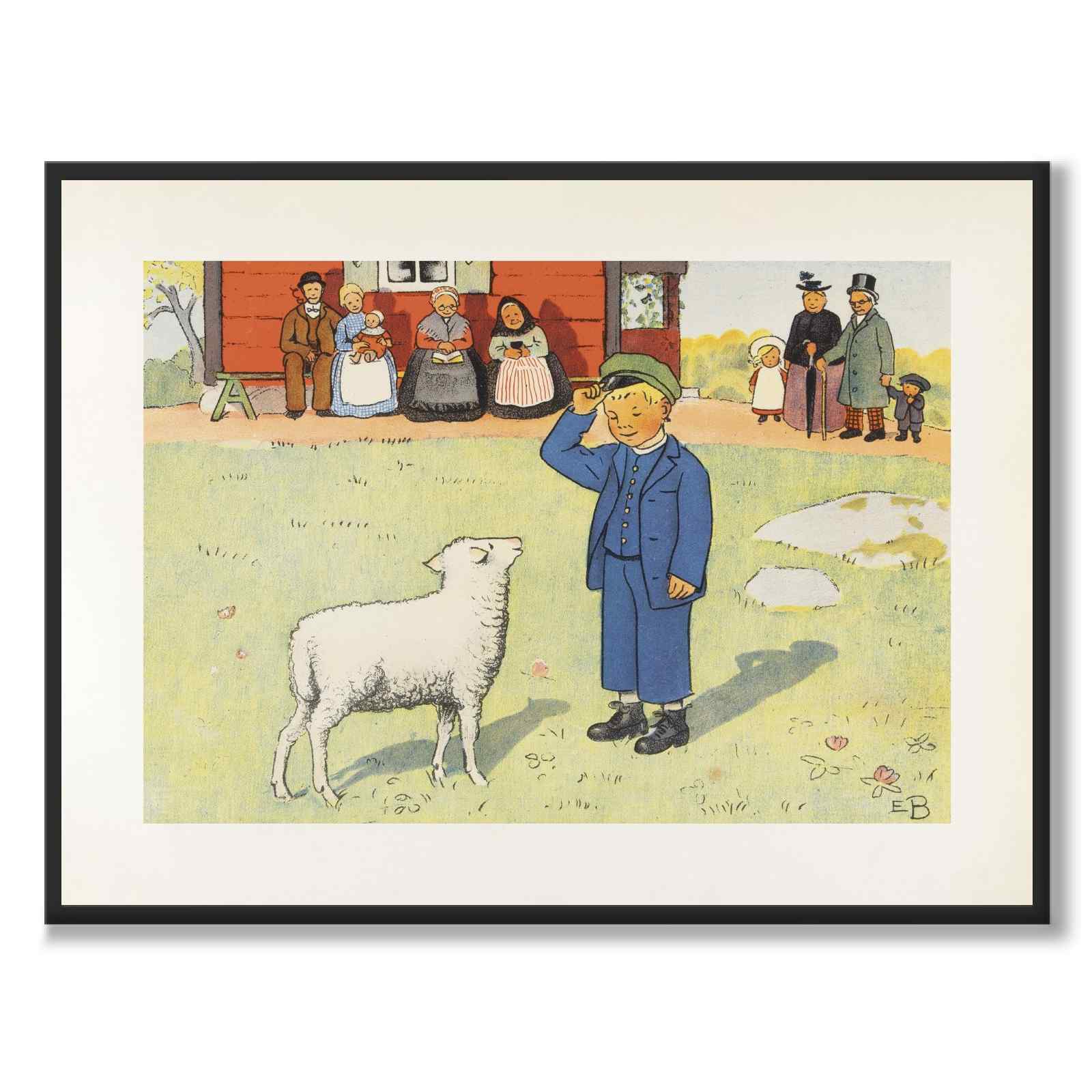 Plakat med vakker illustrasjon fra Elsa Beskows barnebok "Pelles nye klær" som først ble utgitt i 1907.