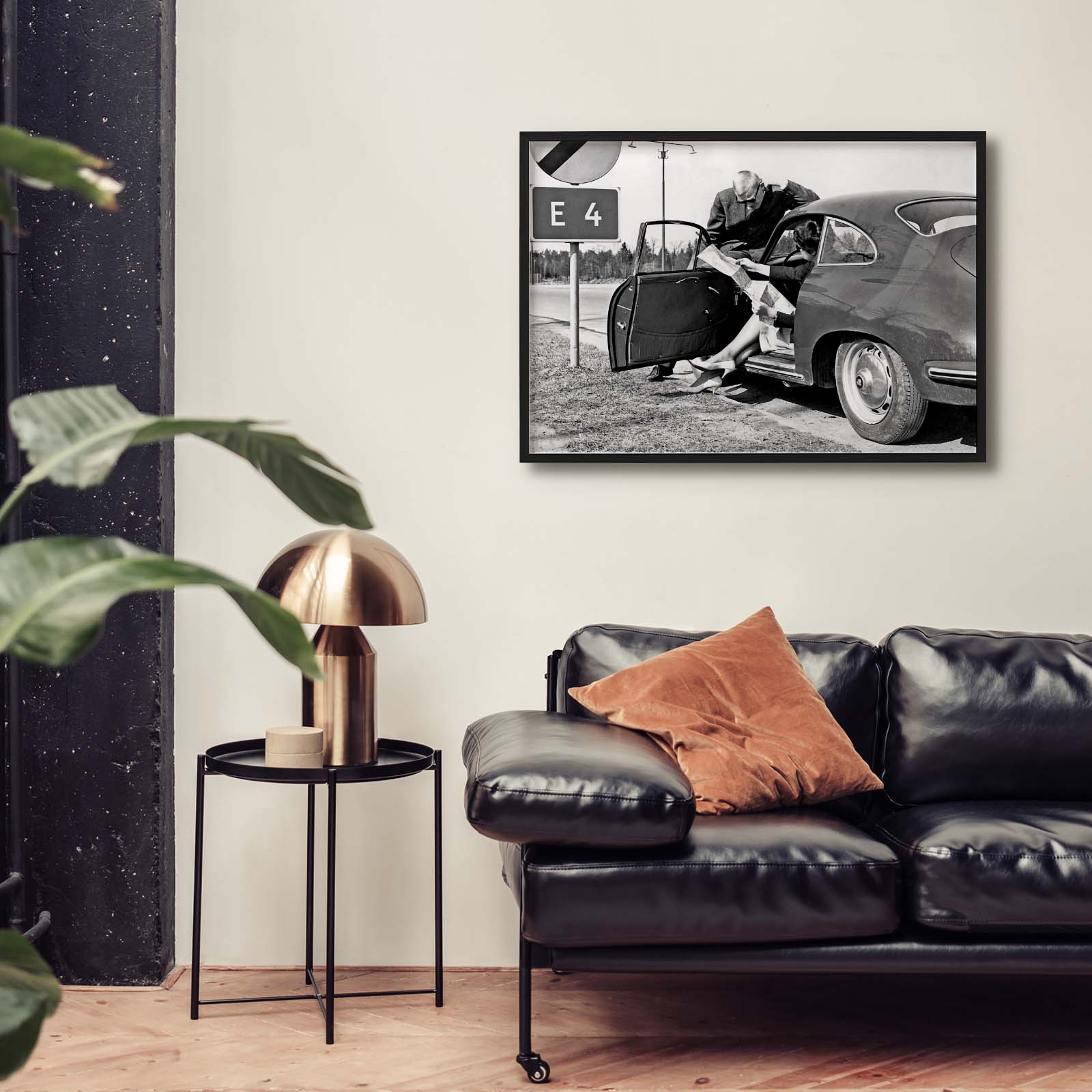 Plakat med bilde av et par som har stoppet ved siden av veien på E4 i sin Porsche 356 for å se på kart en gang på 60-tallet.