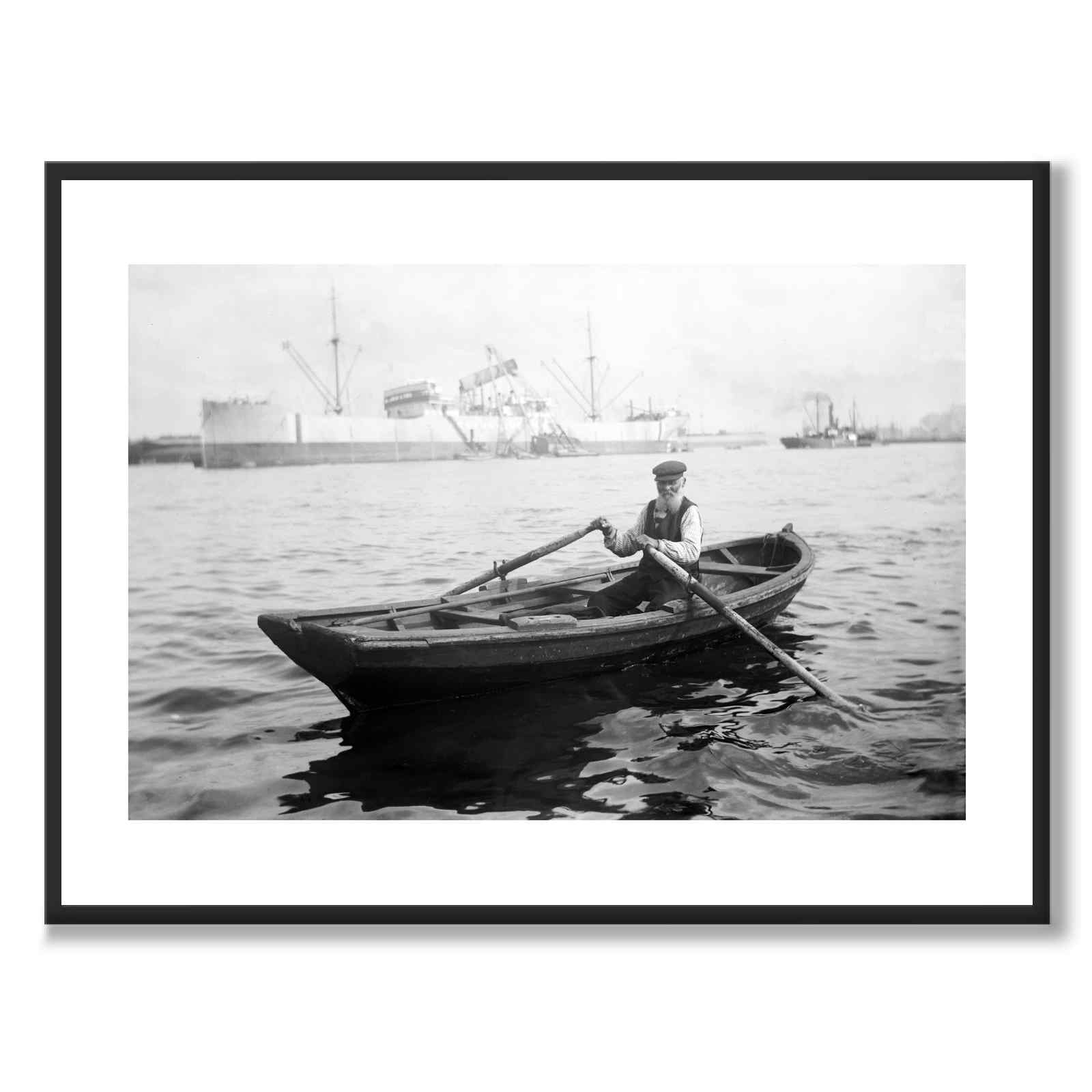 Året er 1916 og på bildet ser vi en eldre mann i en robåt i havnen i Gøteborg. Da bildet ble tatt var mannen, som het Lars Svensson, 77 år gammel.