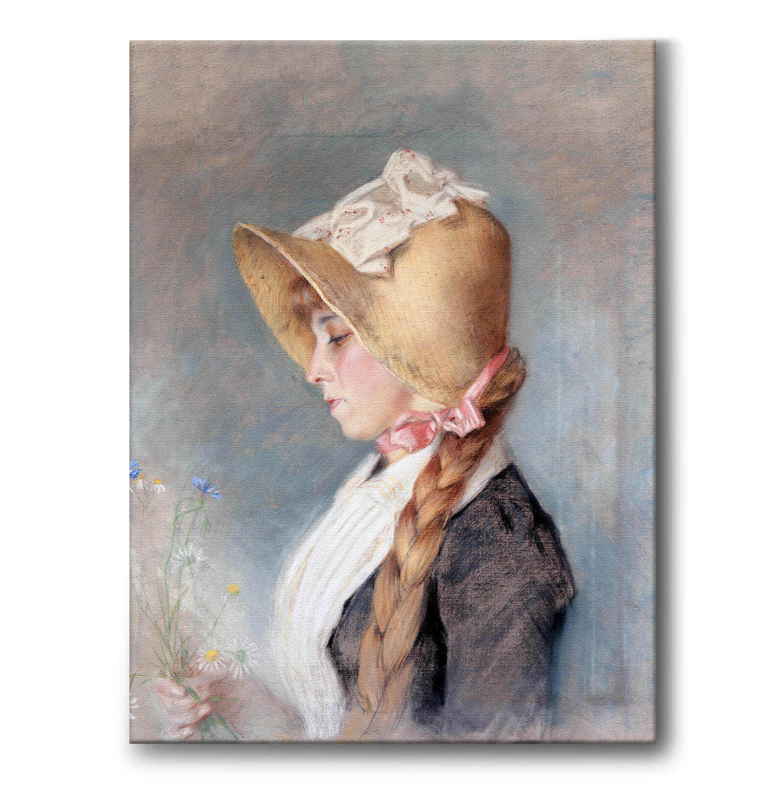 Lerret med det vakre pastellmaleriet Portrait of a Woman av den ikoniske Jenny Nyström fra 1885. På bildet ser vi en vakker kvinne som holder en bukett med ville blomster – tusenfryd og kornblomster.