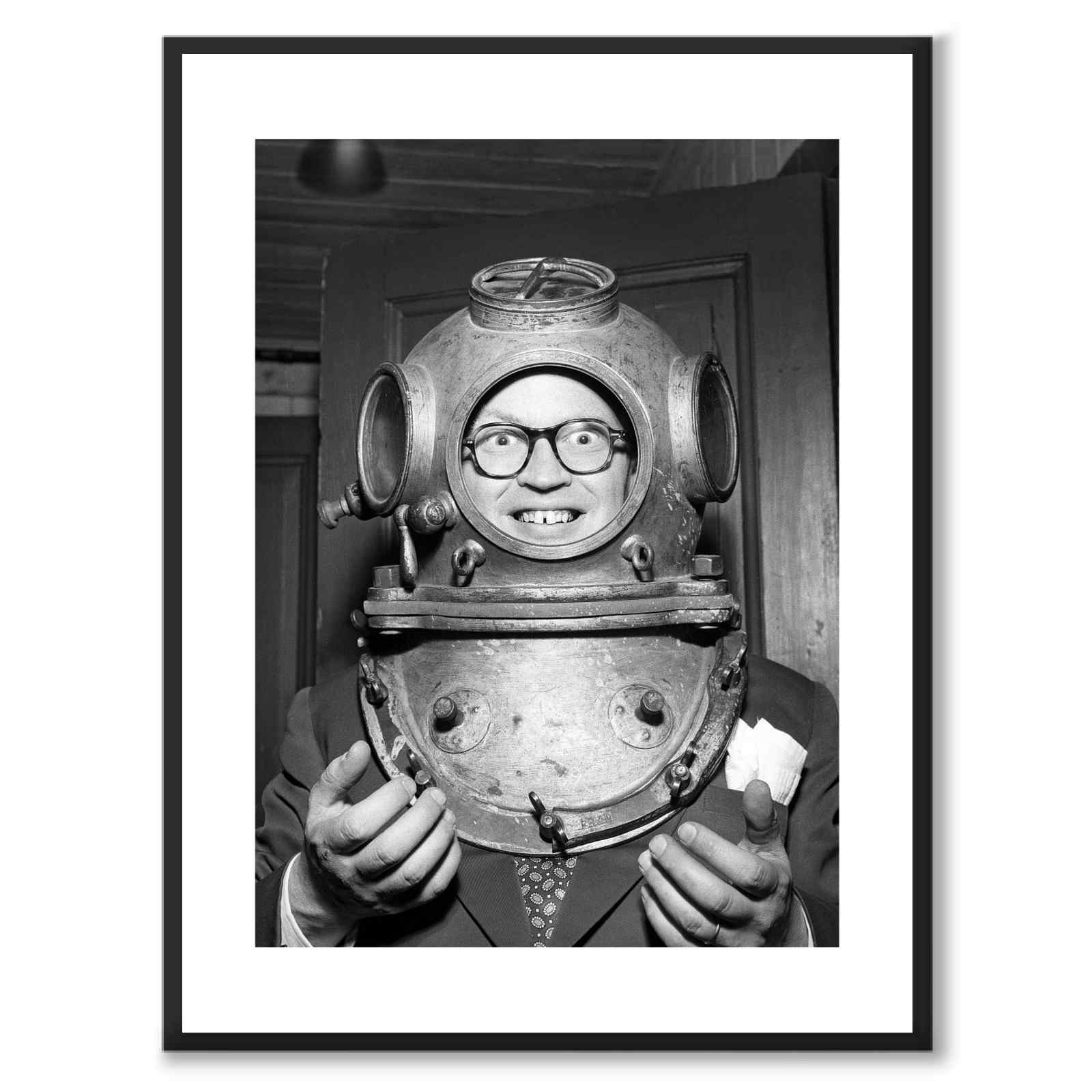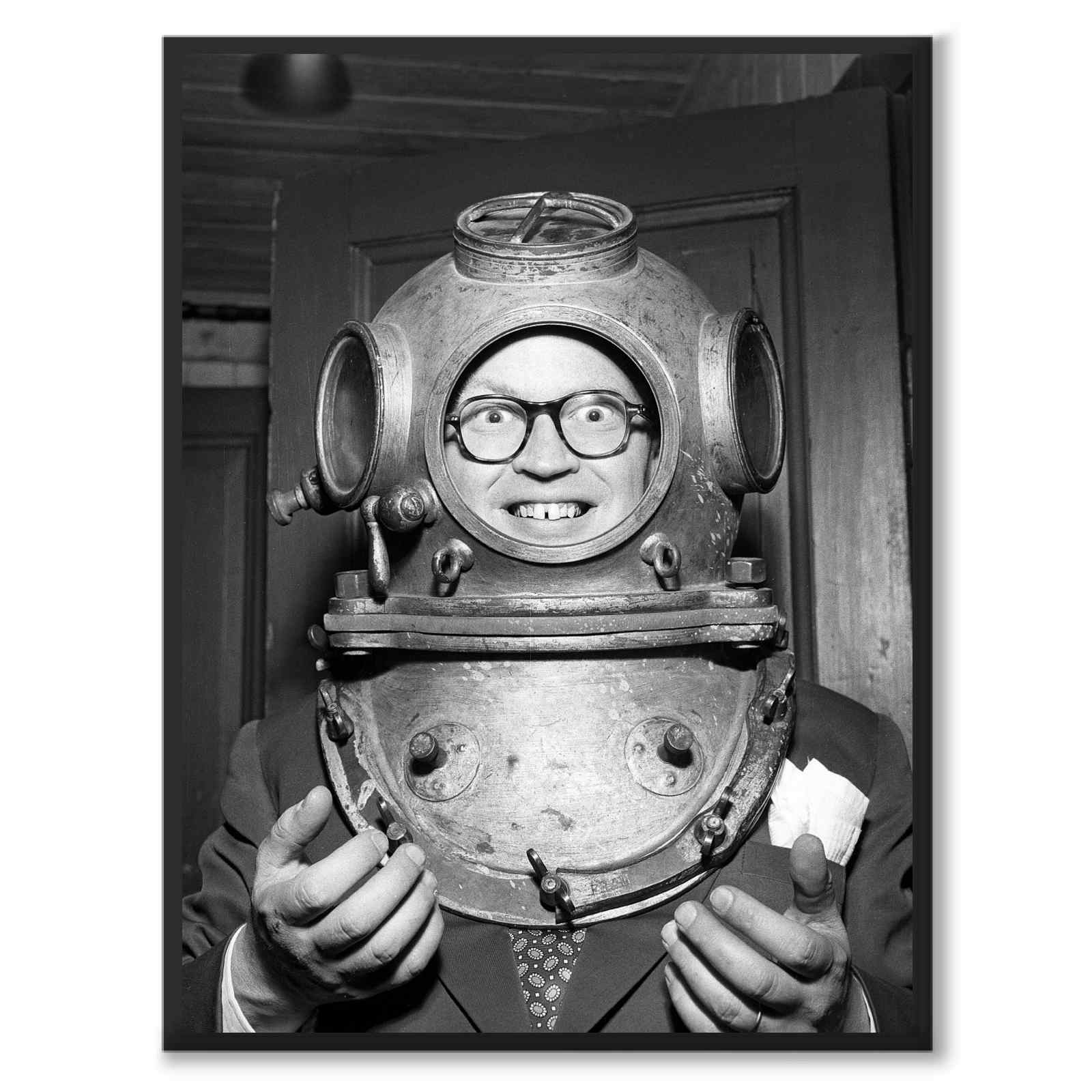 Plakat med Povel Ramel i dykkerhjelm ved premieren på hitrevyen Knappupp - Akta Huvudet, år 1952 i Gøteborg.
