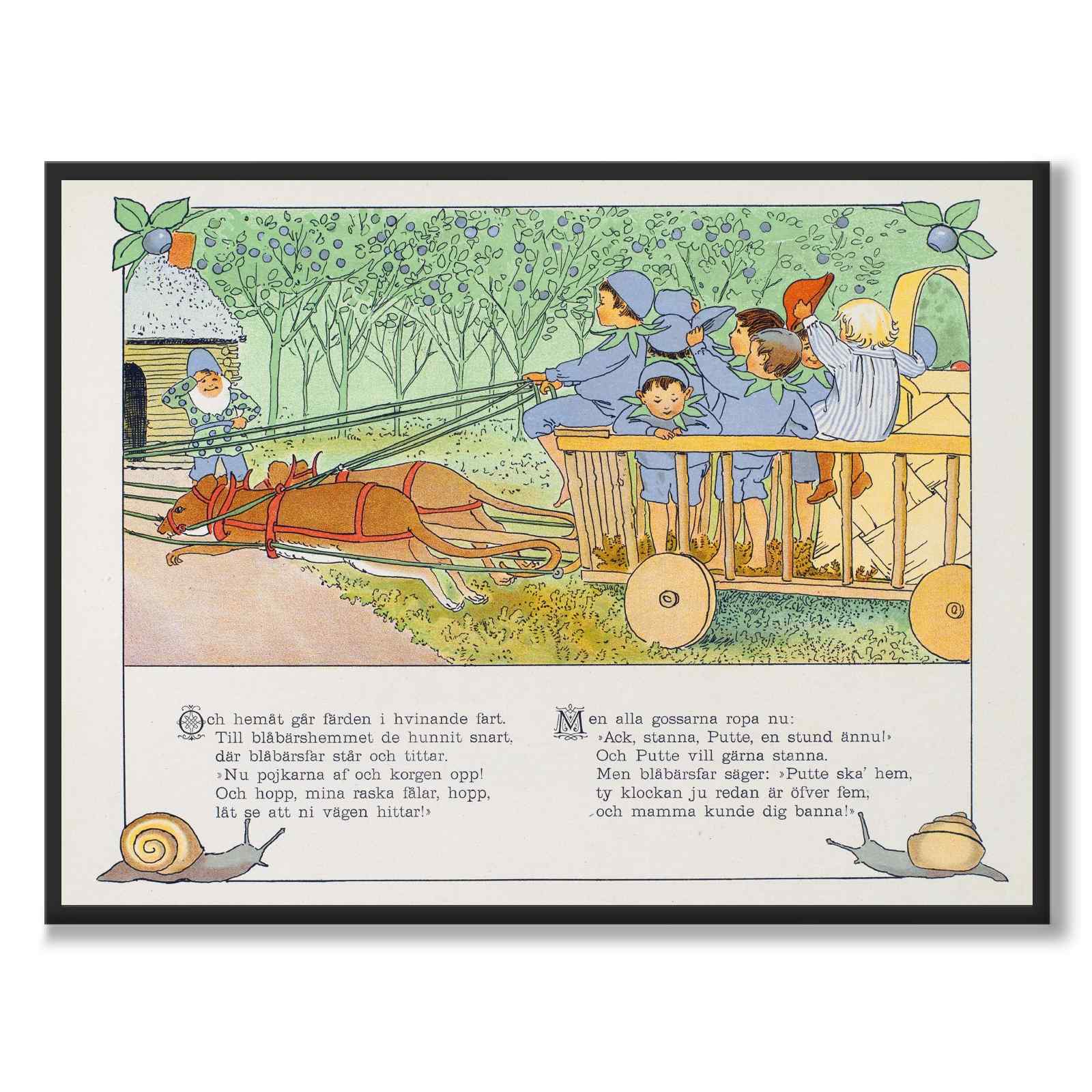 Plakat med illustrasjon fra Puttes Äfventyr i Blåbärsskogen, en elsket svensk barnebok skrevet og illustrert av Elsa Beskow, fra år 1901. Den er et av Beskows mest kjente verk og regnes som en klassiker i svensk barnelitteratur.