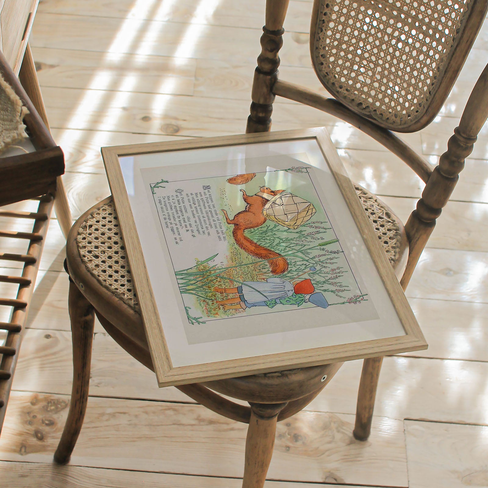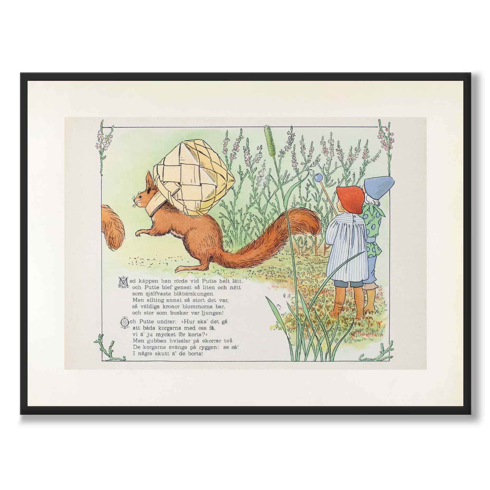 Plakat med illustrasjon fra Puttes äfventyr i blåbärsskogen, en elsket svensk barnebok skrevet og illustrert av Elsa Beskow, fra år 1901. Den er et av Beskows mest kjente verk og regnes som en klassiker i svensk barnelitteratur.