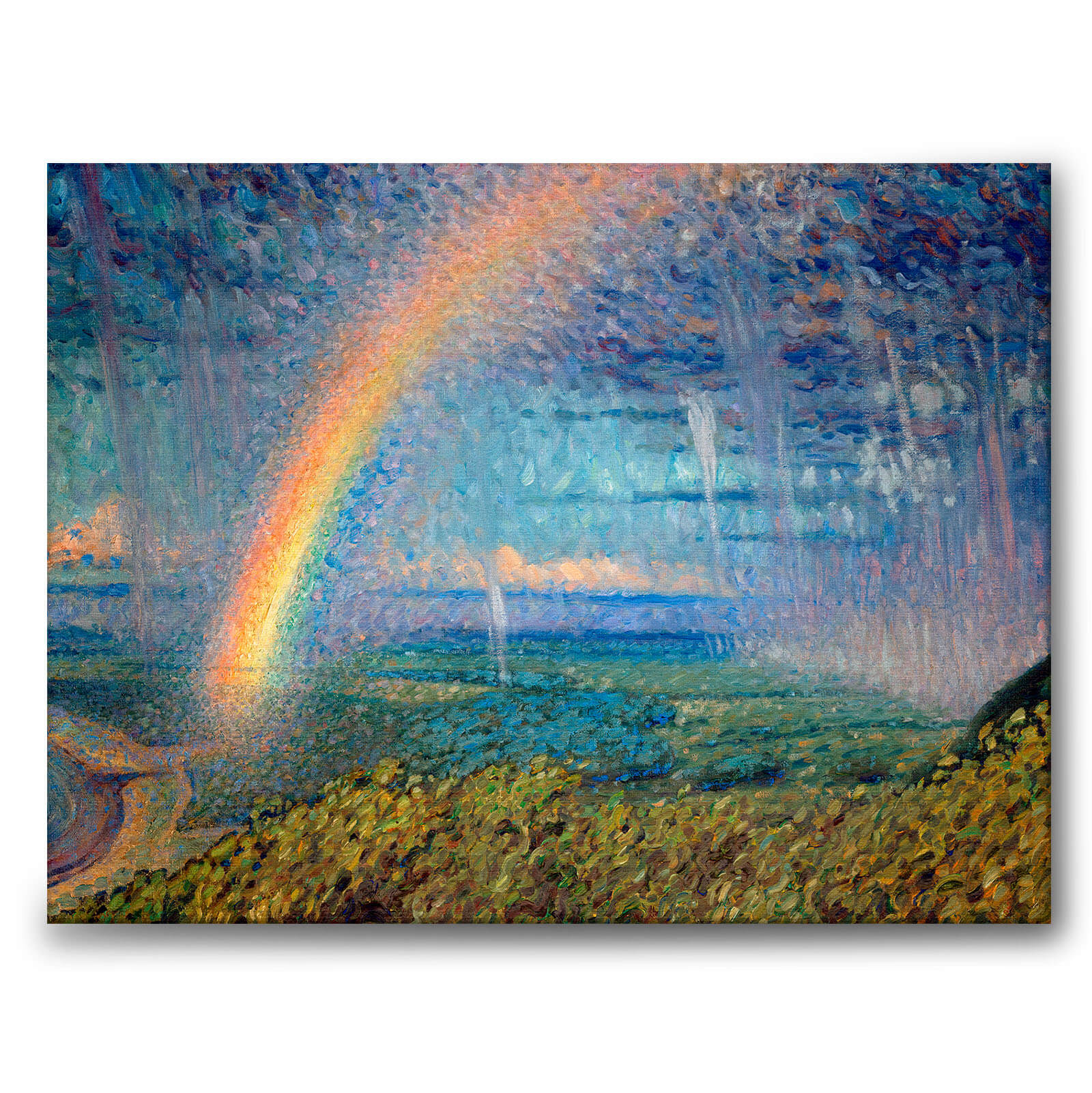Lerret med maleriet Regnbuen av Nils Kreuger (1858-1930). Nils Kreuger var en kjent svensk landskapsmaler med bakgrunn fra Royal Academy of Arts og fra en privat kunstskole i Paris. Jo lenger Kreuger var aktiv, jo mer ble motivene fokusert på skumring, regn eller tåke. Hans første utstilling var i Paris i 1882.