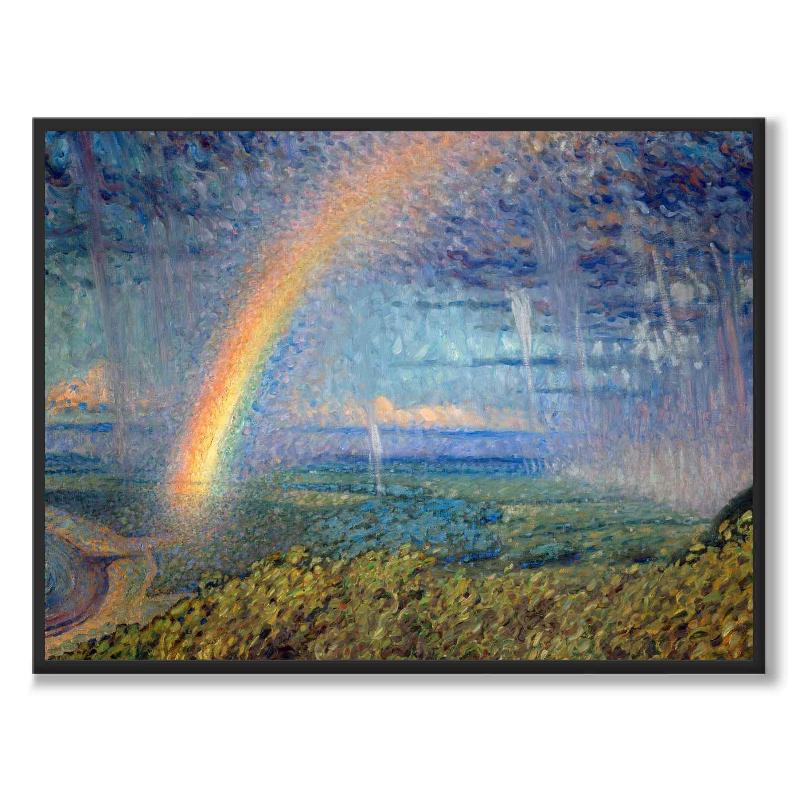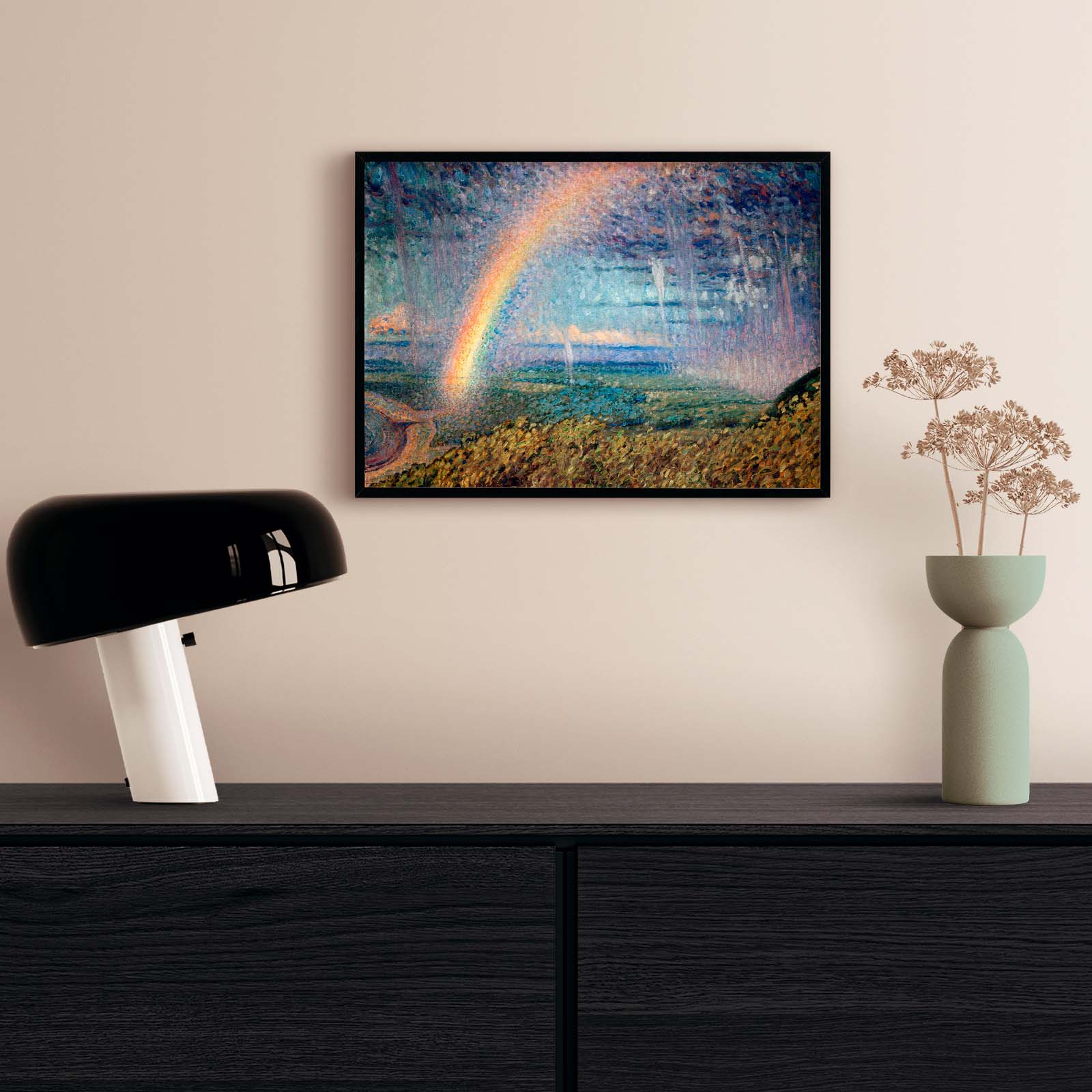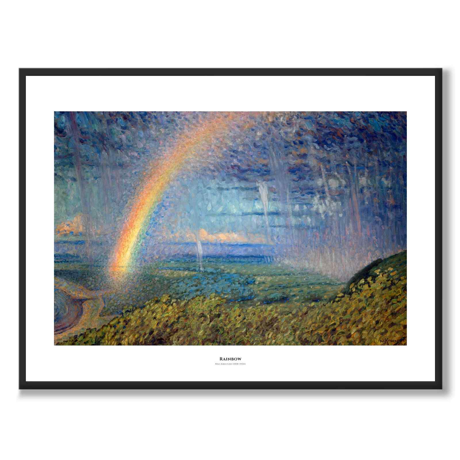 Plakat med maleriet Regnbuen av Nils Kreuger (1858-1930). Nils Kreuger var en kjent svensk landskapsmaler med bakgrunn fra Royal Academy of Arts og fra en privat kunstskole i Paris. Jo lenger Kreuger var aktiv, jo mer ble motivene fokusert på skumring, regn eller tåke. Hans første utstilling var i Paris i 1882.