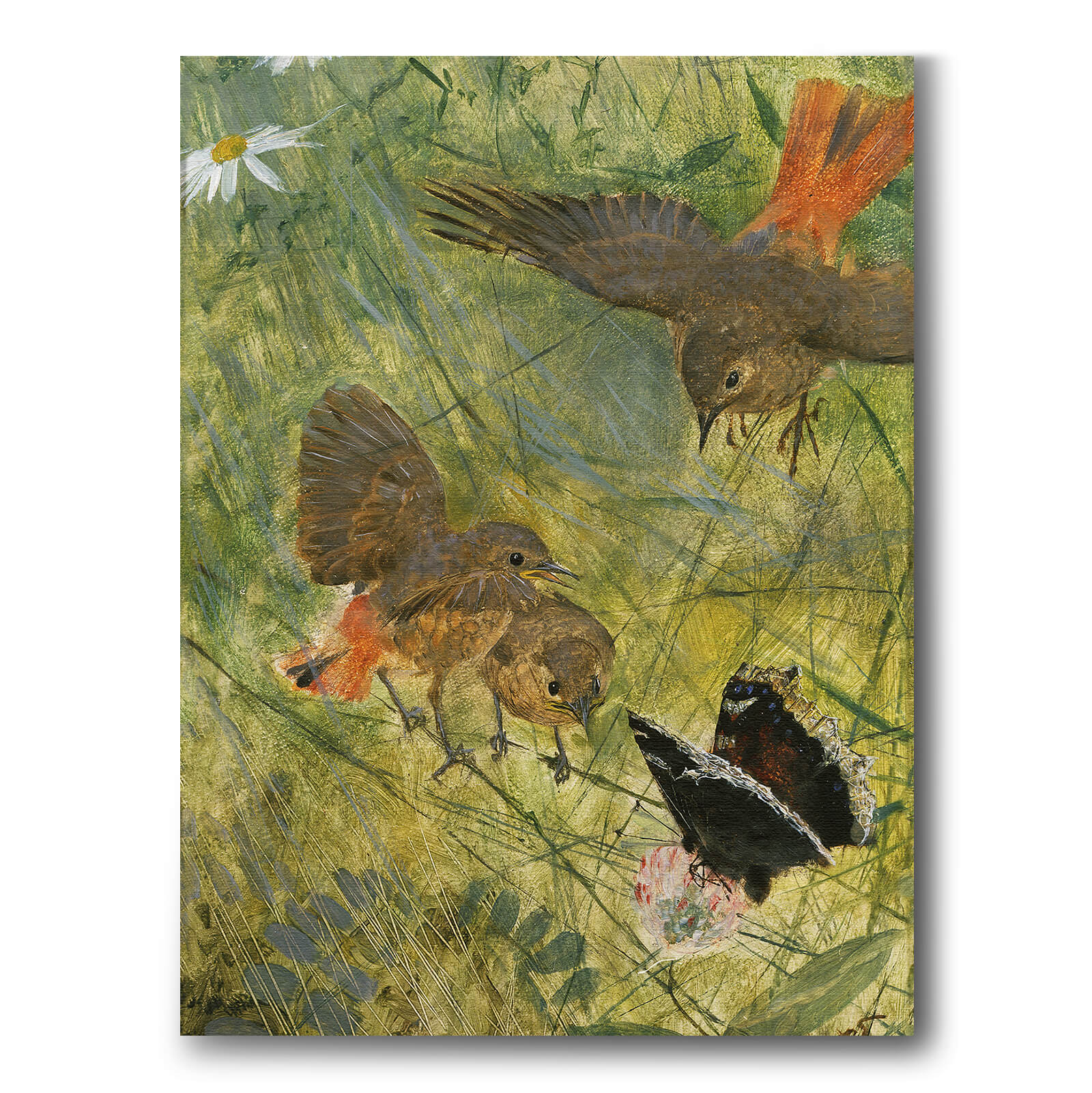 Maleriet viser et par rødstjerter, en liten fugleart, sammen med en sommerfugl. Liljefors skildrer disse dyrene i deres naturlige miljø, med stor detaljrikdom og en sans for deres atferd og samhandling. Liljefors var inspirert av naturen og tilbrakte mye tid utendørs, hvor han studerte dyrs atferd og deres omgivelser. Han brukte ofte fotografier som et hjelpemiddel for å fange detaljene nøyaktig.