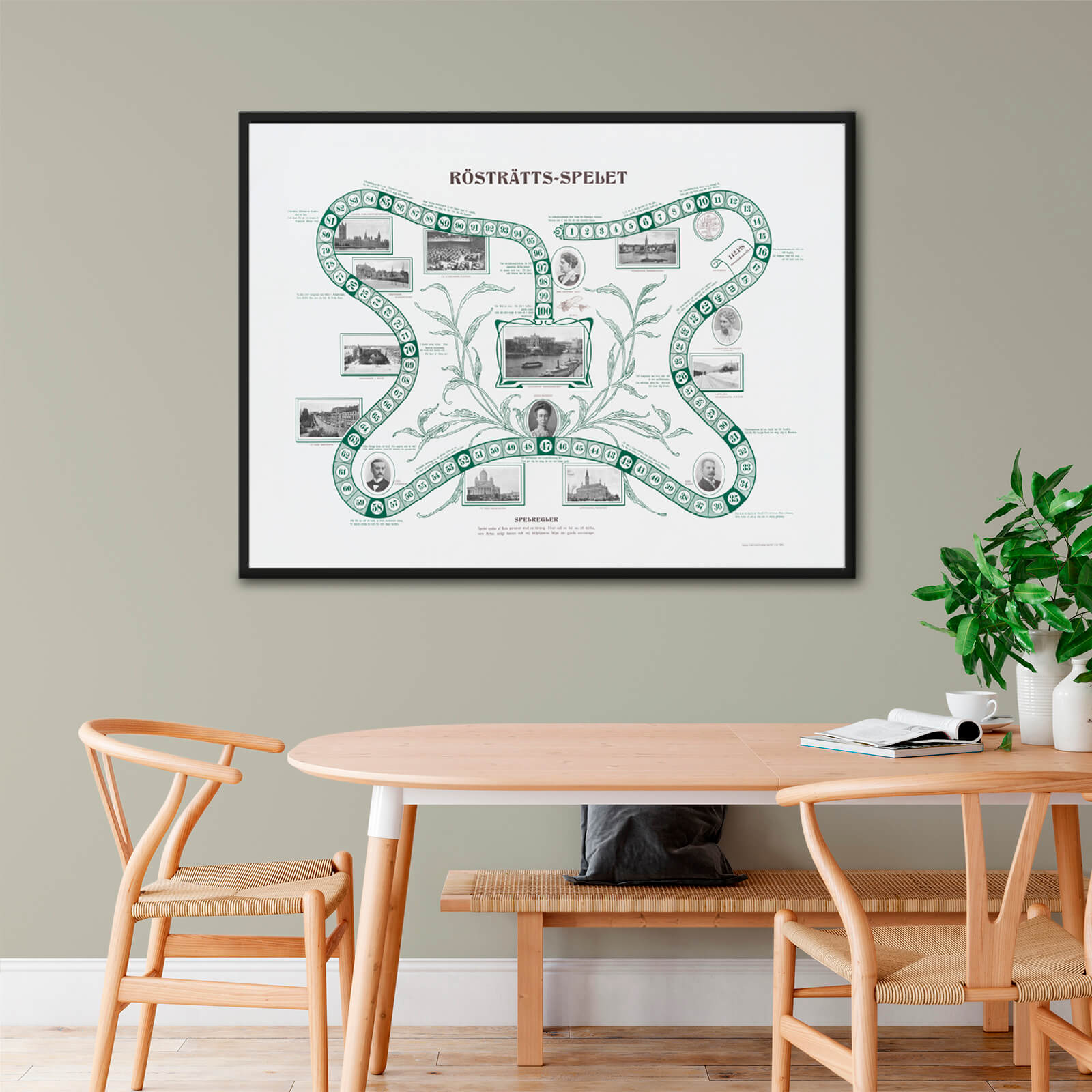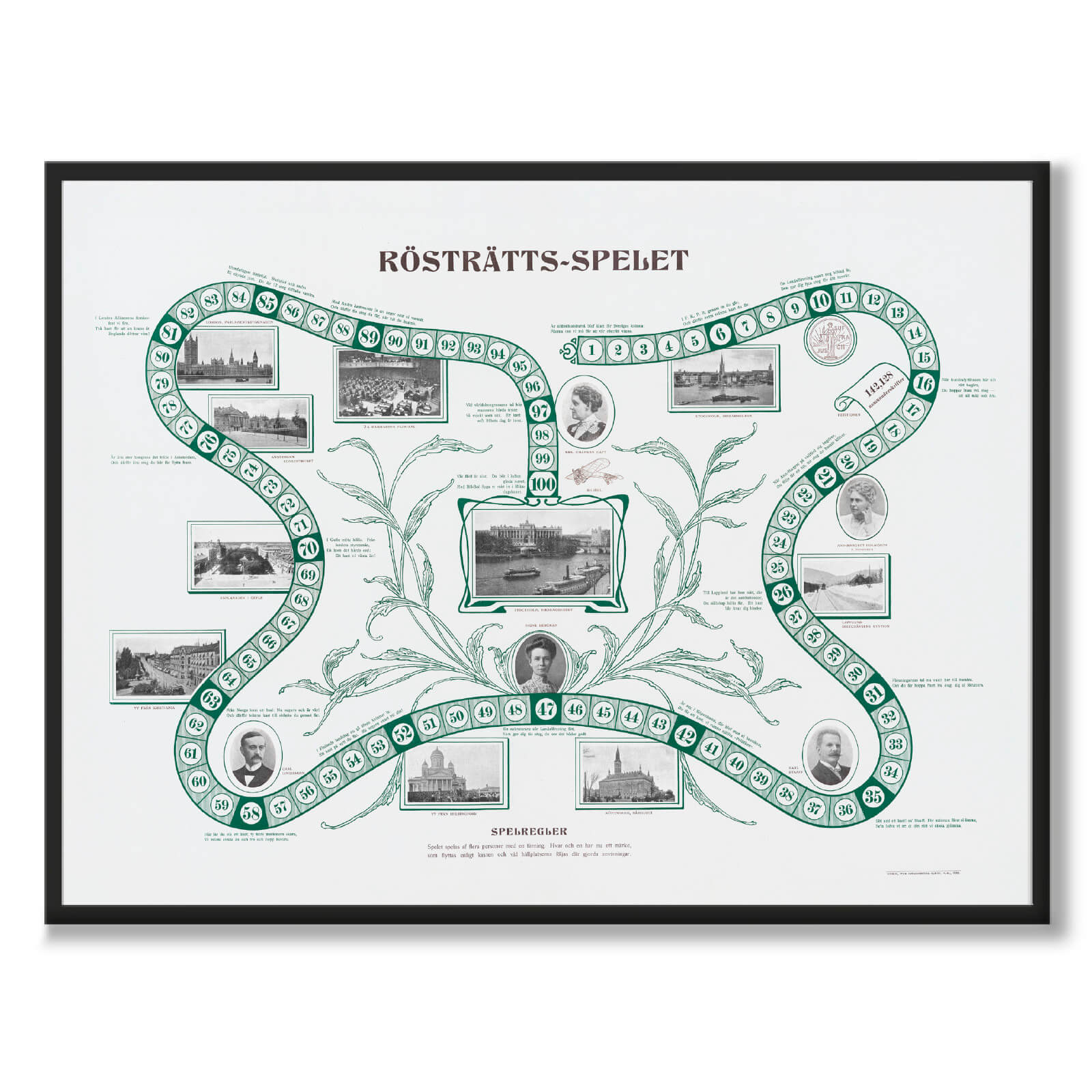 Dette designet kalles The Suffrage Game og er en fantastisk og kraftig illustrasjon som viser kvinnebevegelsens reise og fremgang tidlig på 1900-tallet. Stemmerettsspillet representerer et terningspill og ble distribuert som et postkort i 1910 for å fremme kvinners likestilling og stemmerett.