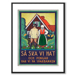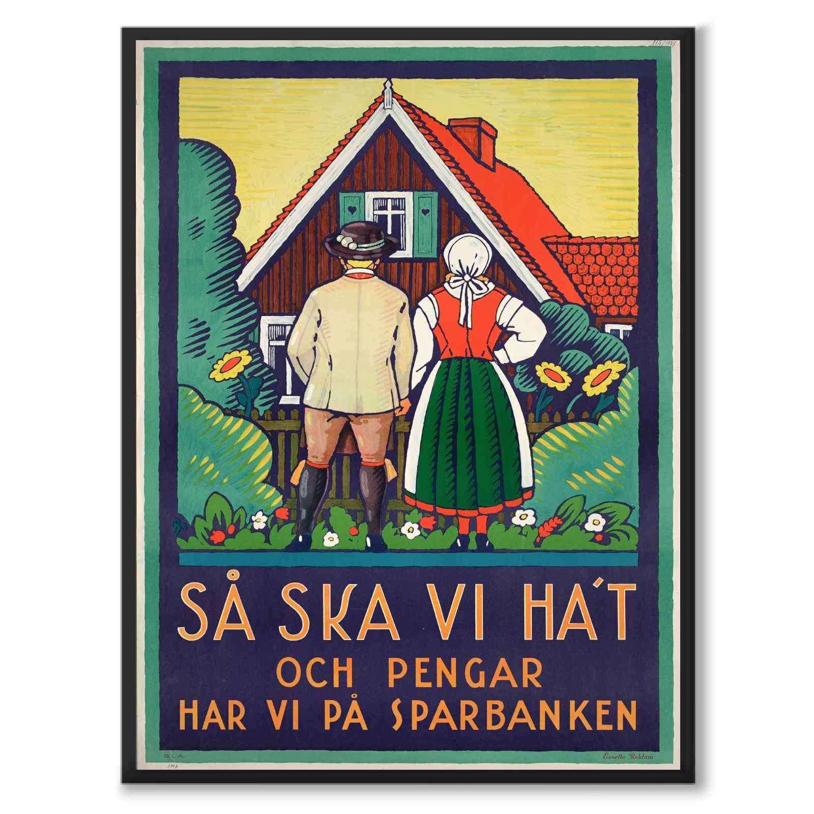 En unik plakat med en vakker, fargerik reklameplakat fra år 1927. Annonsen er for Sparbanken , som kan sees gjennom teksten: Sånn har vi det - og vi har penger i Sparbanken .