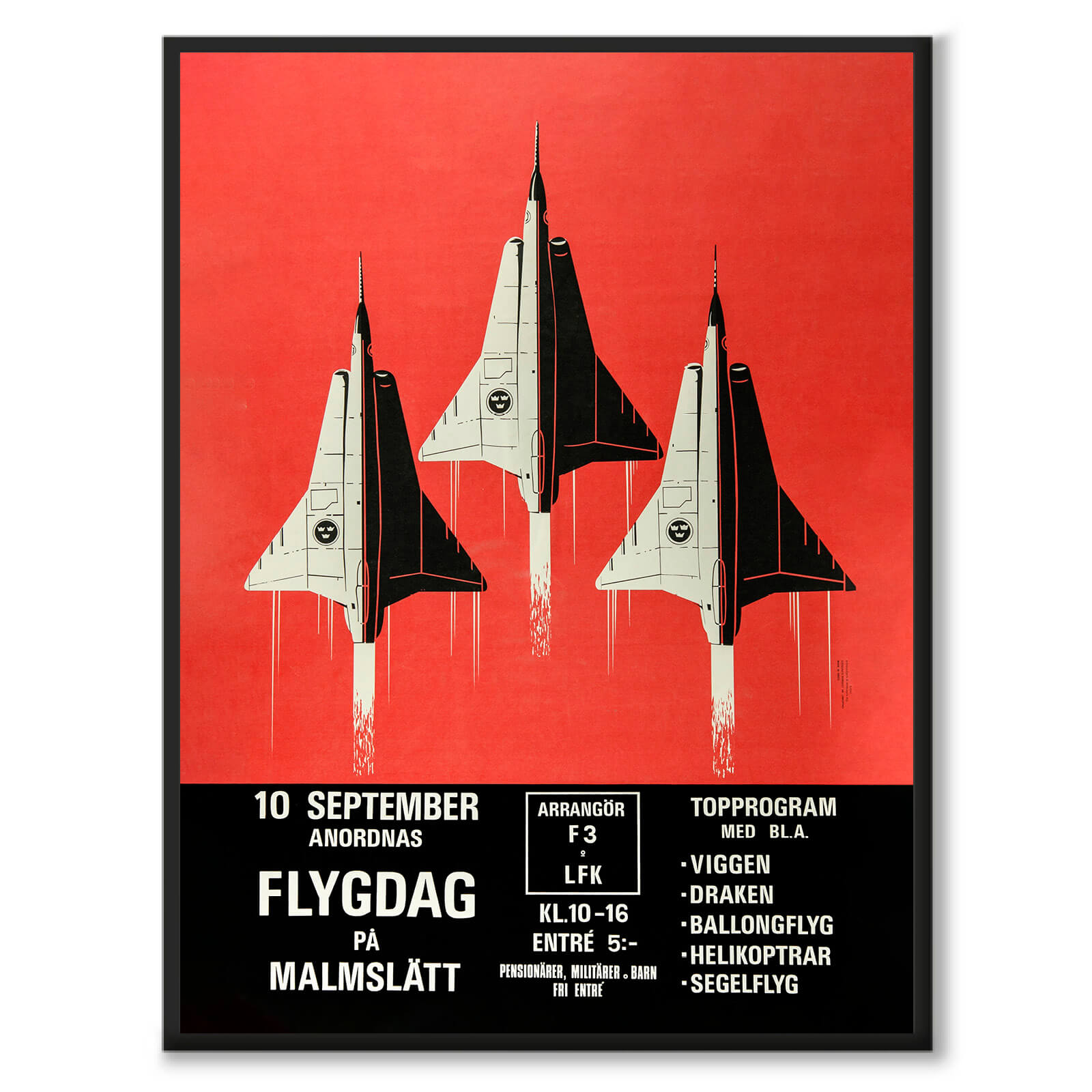 Reklameplakat for en flydag på Malmslätt i Linköping. Flygdagen ble arrangert av F3 og LFK og viste blant annet frem ikoniske fly som Draken og Viggen