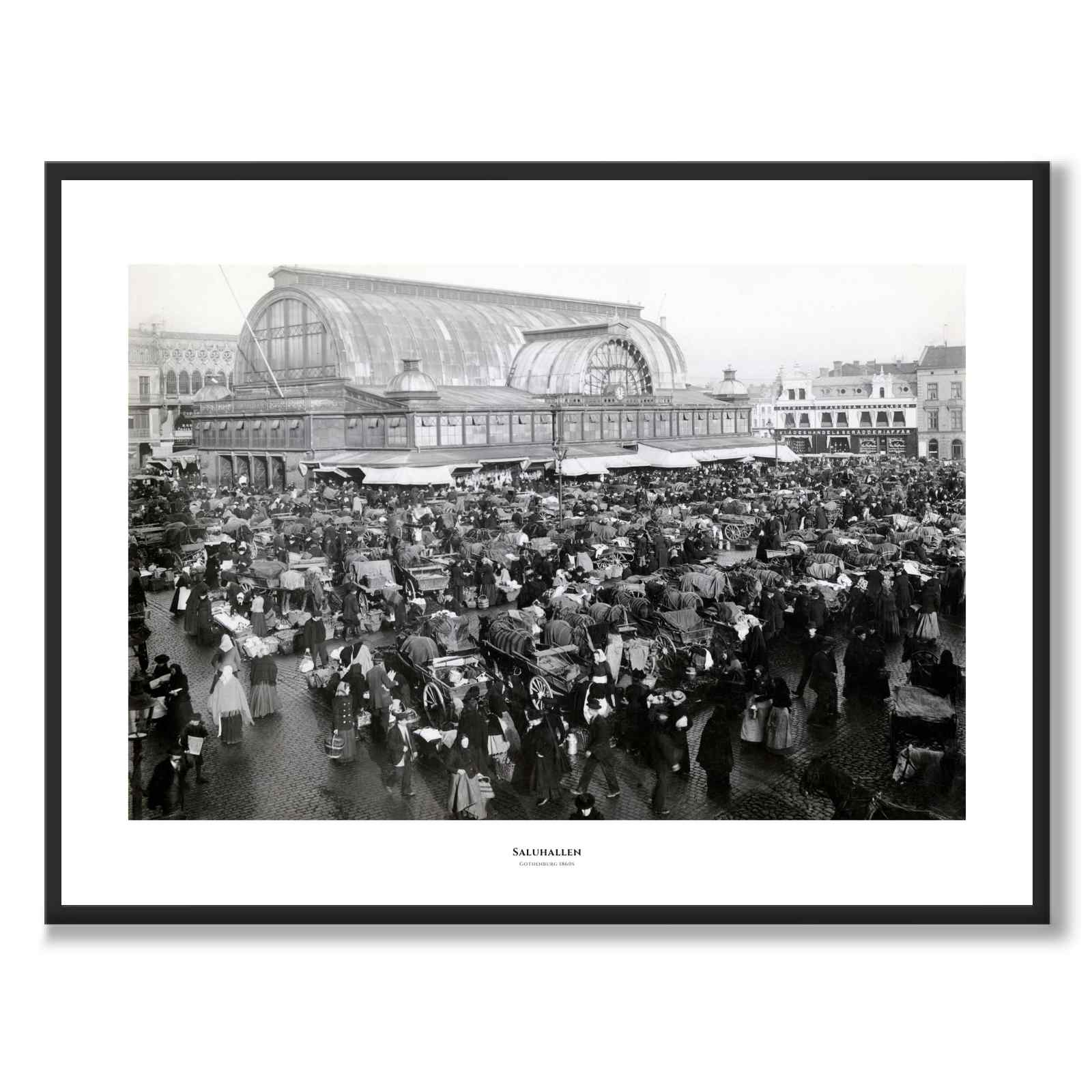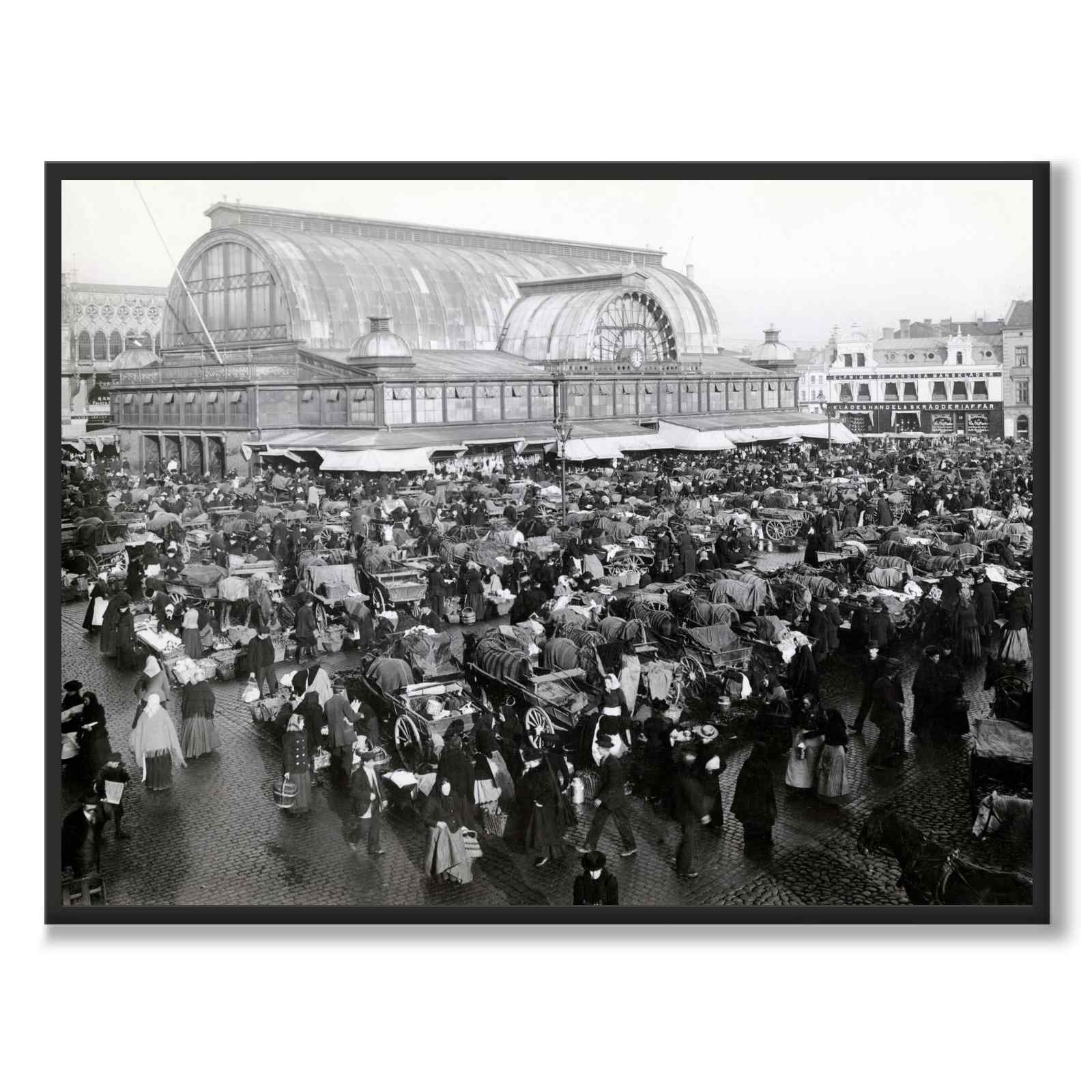 Plakat med gammelt bilde av Kungstorget med Saluhallen i Gøteborg på 1890-tallet.