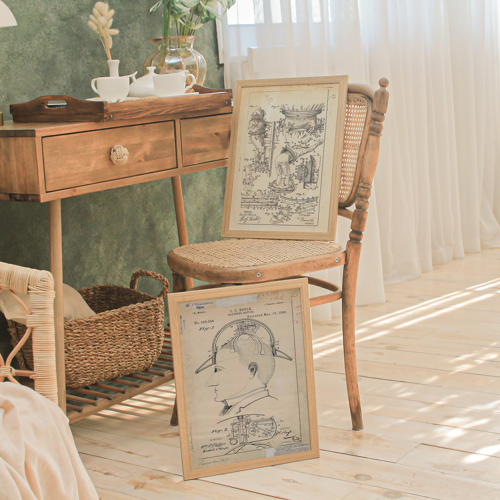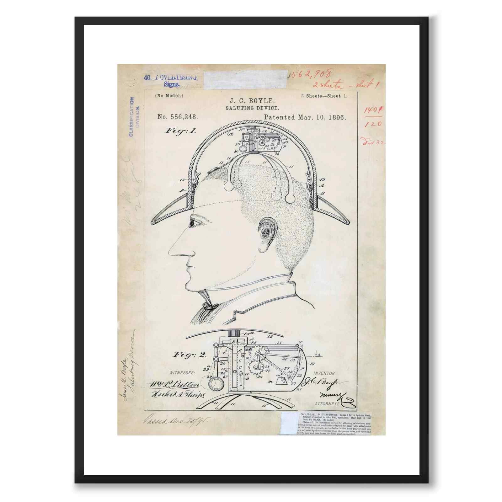 Plakat av en gammel patenttegning av en "Saluting Device" laget av JC Boyle og patentert 10. mars 1896.