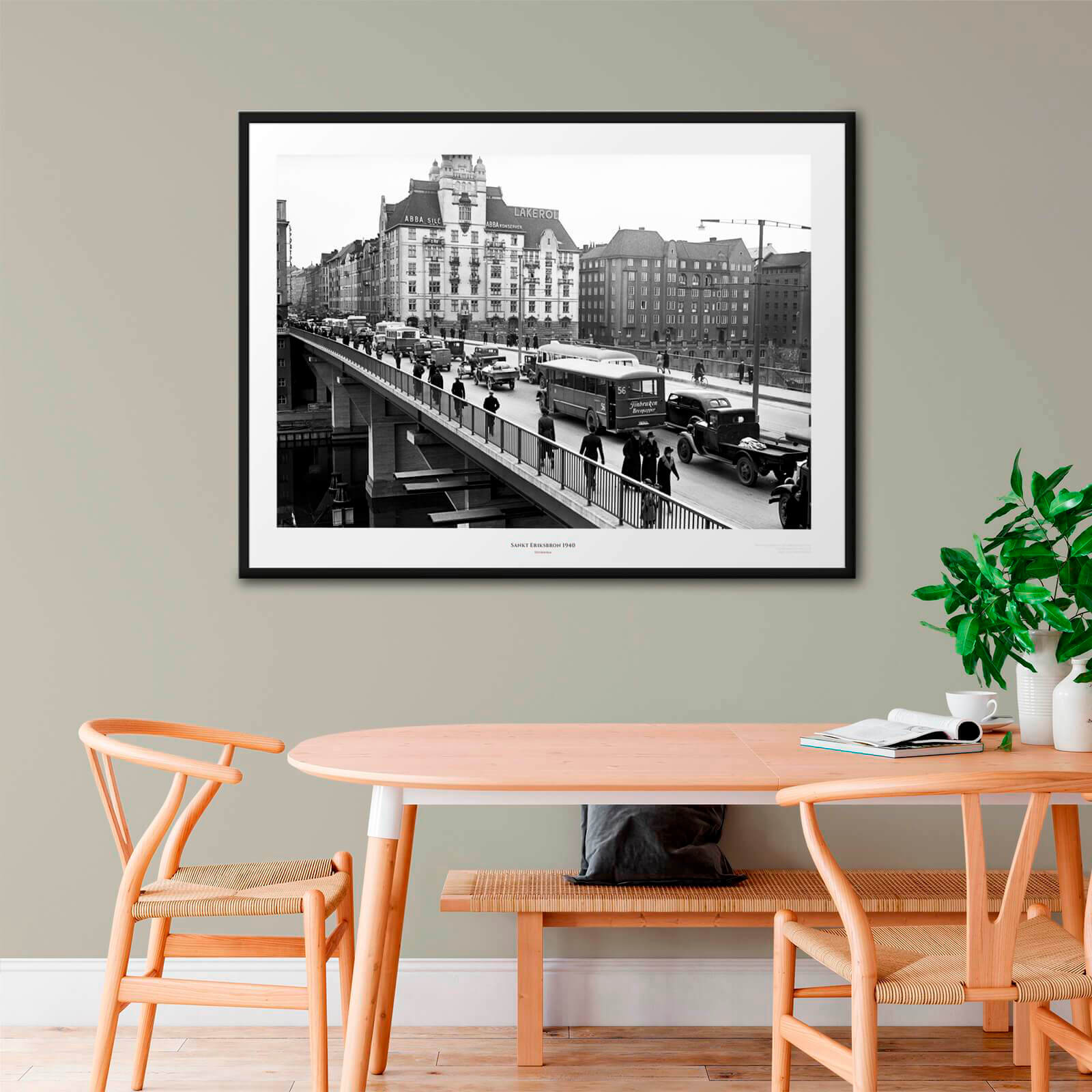 Bilkøer på Sankt Eriksbron i 1940. I bakgrunnen ser vi Sankt Erikspalatset på Kungsholmen.