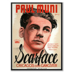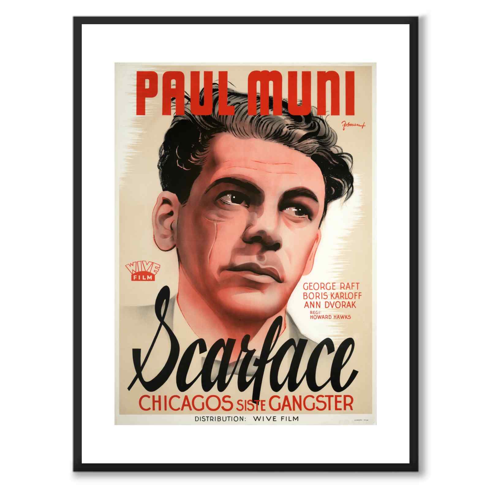Denne ikoniske filmplakaten fremhever Paul Munis mektige opptreden som den hensynsløse mobbsjefen Tony Camonte, en rolle som ble en milepæl i karrieren hans. Filmens skildring av organisert kriminalitet og dens brutale virkelighet gjorde «Scarface» til en umiddelbar hit og en tidløs klassiker.