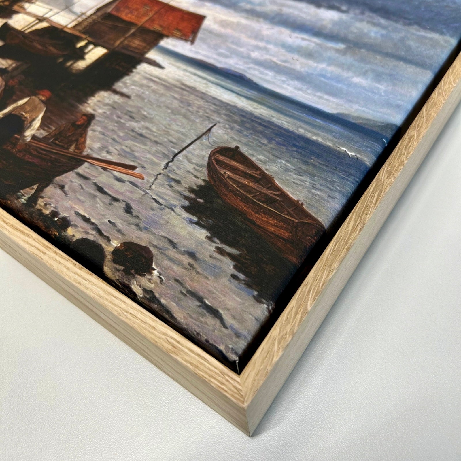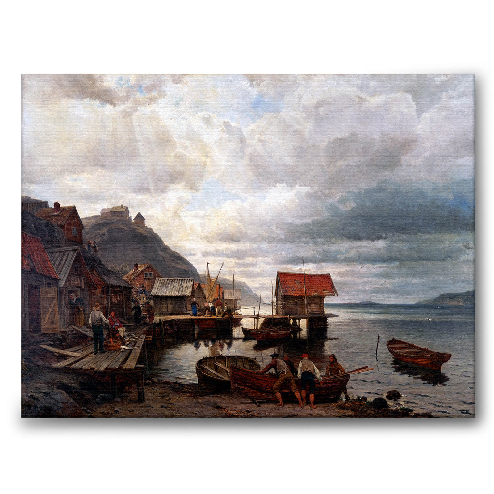 Vakkert lerret med maleriet Scene fra Sveriges vestkyst, opprettet i 1873 av Johan Edvard Bergh. På bildet ser vi folk som jobber ved en liten havn, mens noen solstråler skinner gjennom skyene.