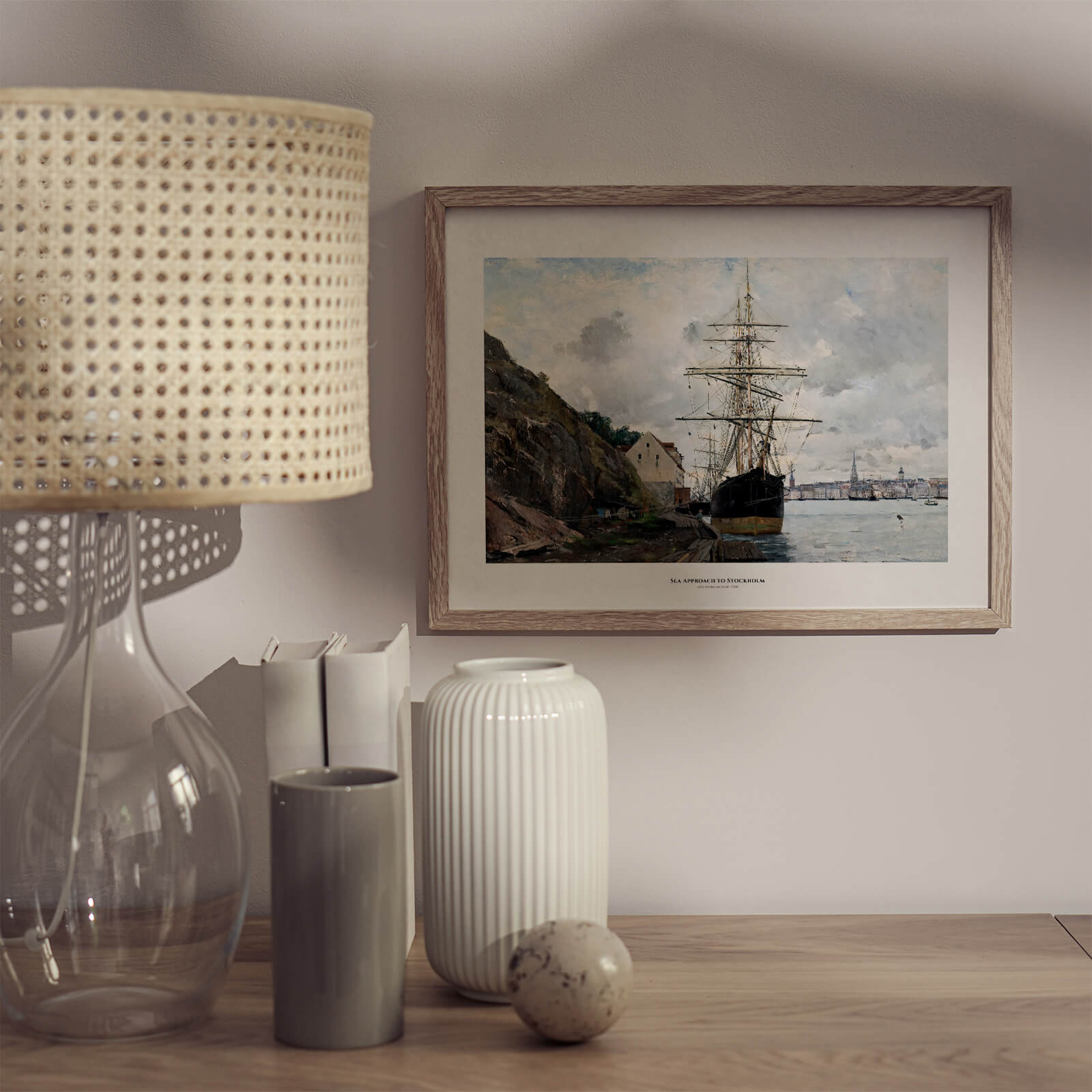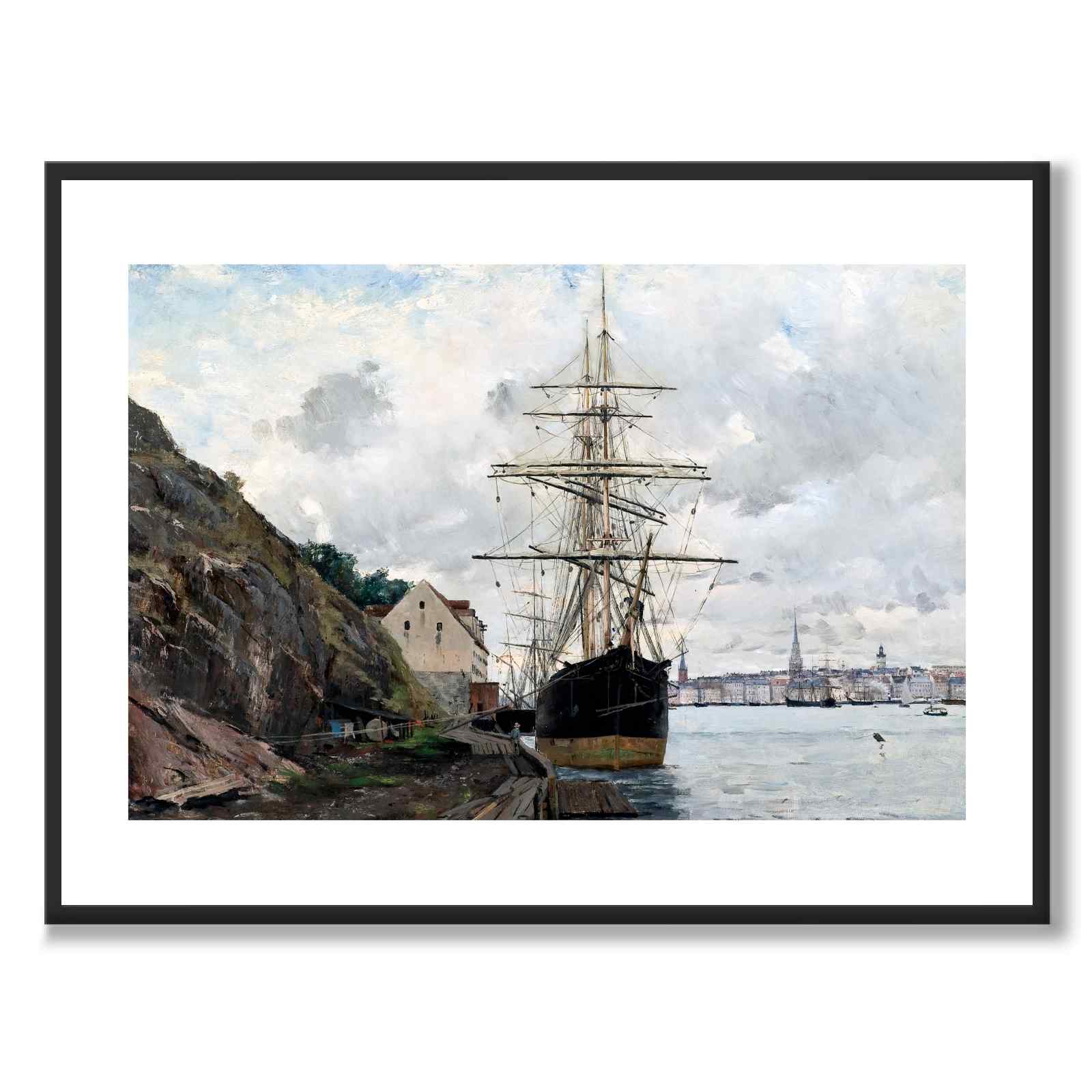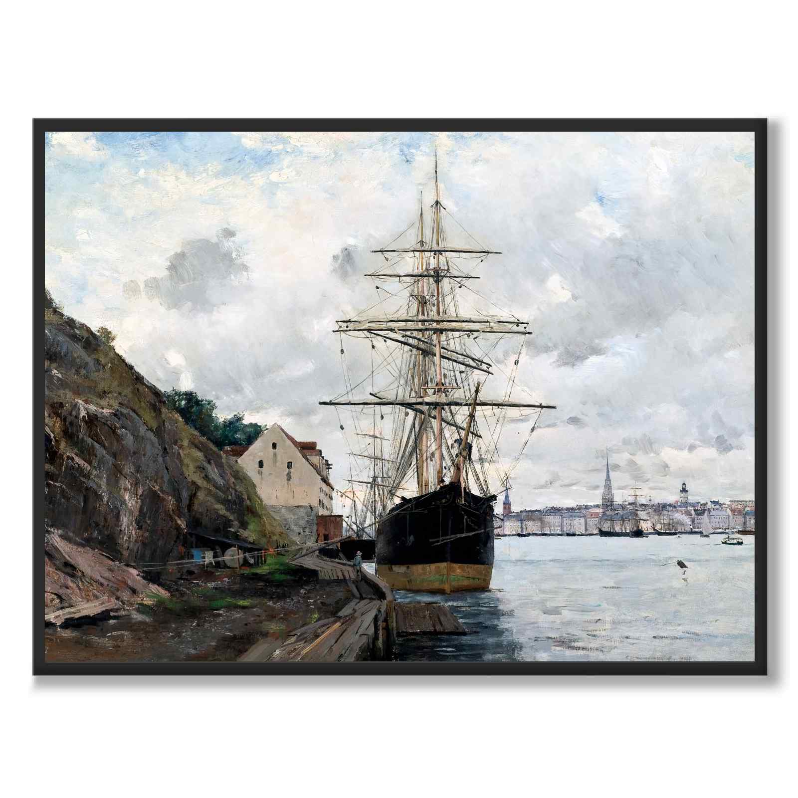 Plakat med maleriet Inngangen til Stockholm av Axel Lindman fra 1885. I bakgrunnen ser vi Skeppsbron, Storkyrkan og de mange andre vakre bygningene i Gamlebyen. I fokus på bildet ser vi en skute fortøyd ved kai ved trolig Södermalm, om ikke lenger ut ved Danviken eller Kvarnholmen.