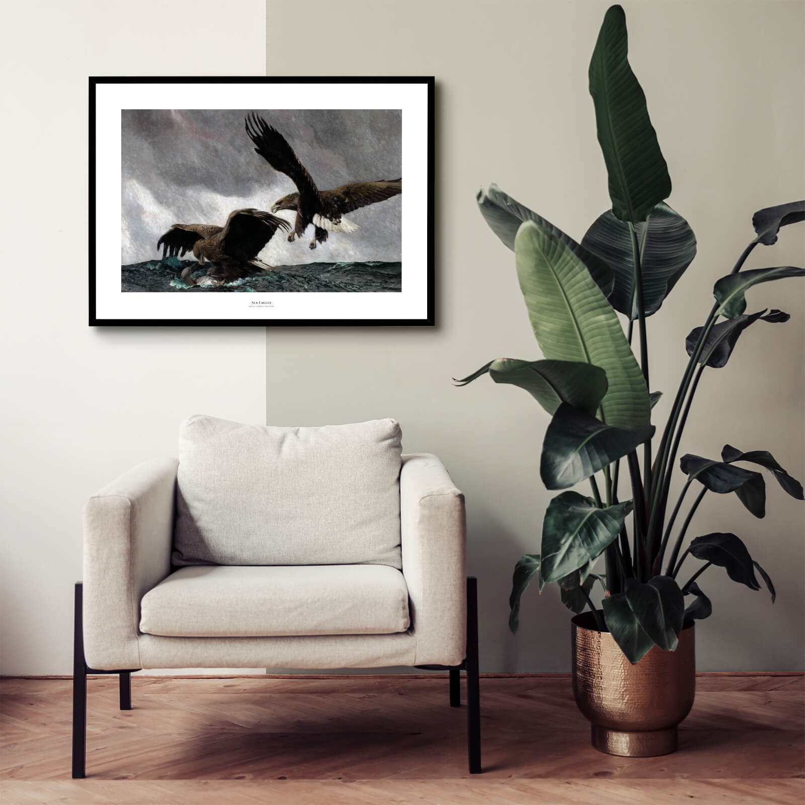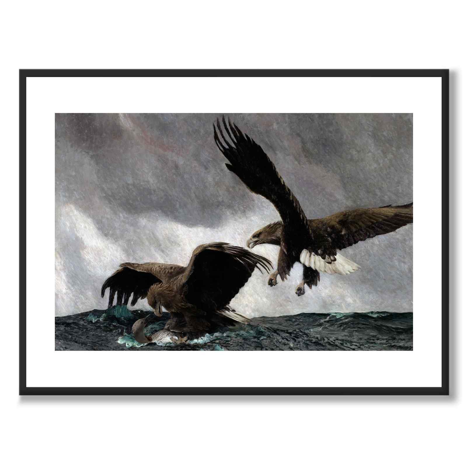 Et dramatisk maleri av Bruno Liljefors fra 1897 som viser to havørner som angriper en annen fugl, trolig en havsule, på et stormfullt hav.