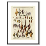 Plakat med et vakkert kart over ulike skjell fra 1800-tallet. Et tjuetalls typer skjell er illustrert forfra og bak med tilhørende nummerering.