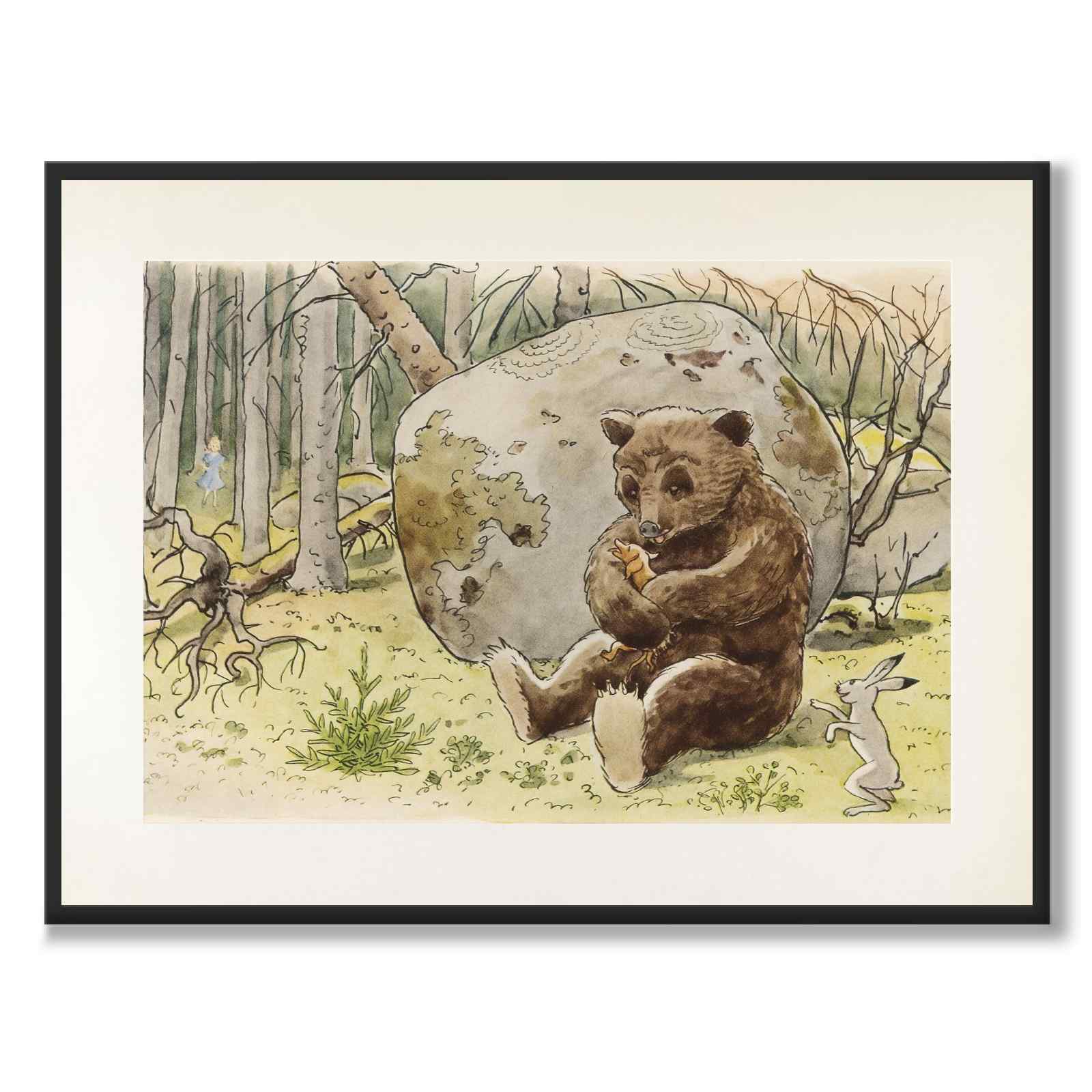 Bilden visar en scen där en björn sitter lutad mot ett stort stenblock i skogen och håller något i sina tassar. En hare står försiktigt framför honom och verkar nyfiket närma sig. I bakgrunden skymtar en liten prinsessa mellan träden.