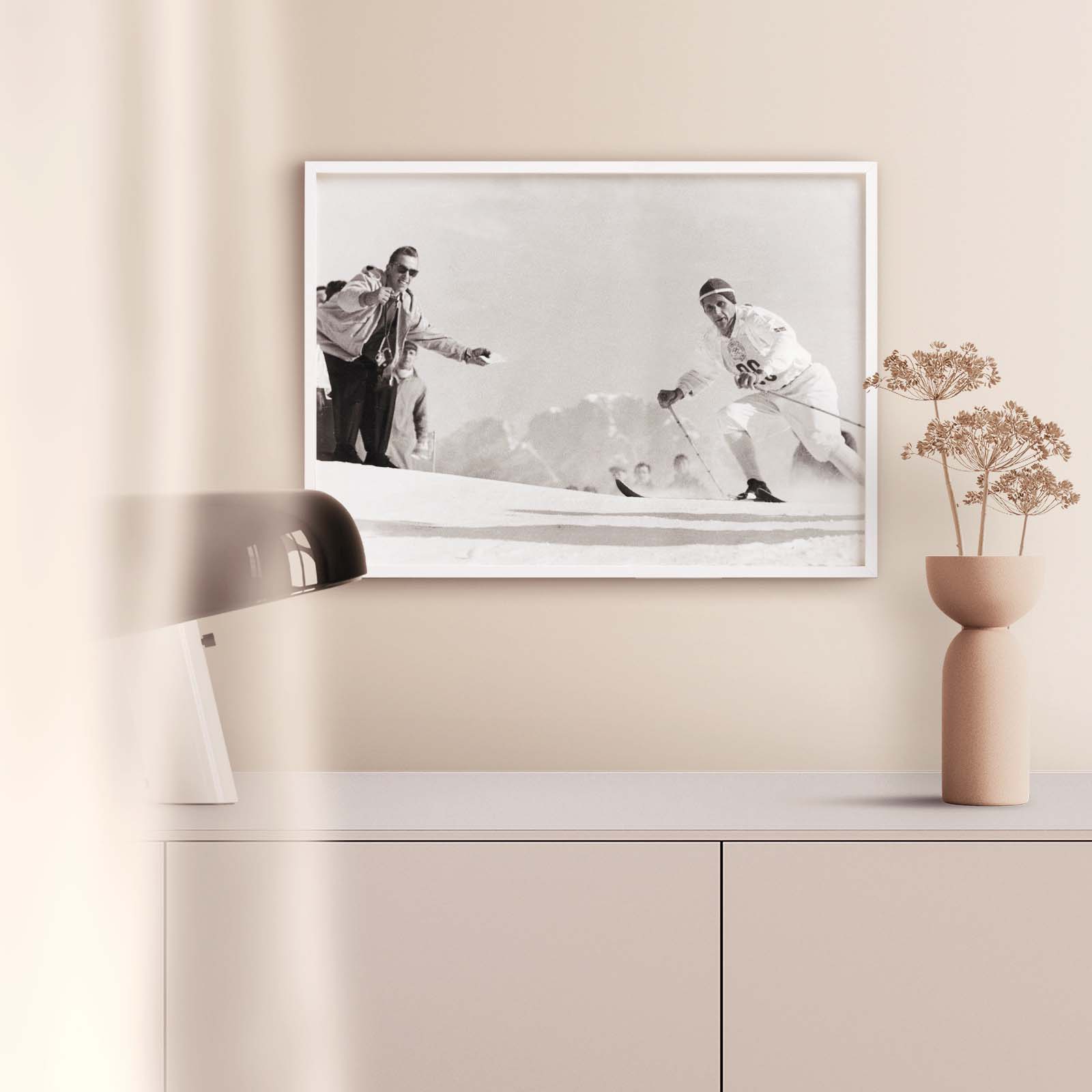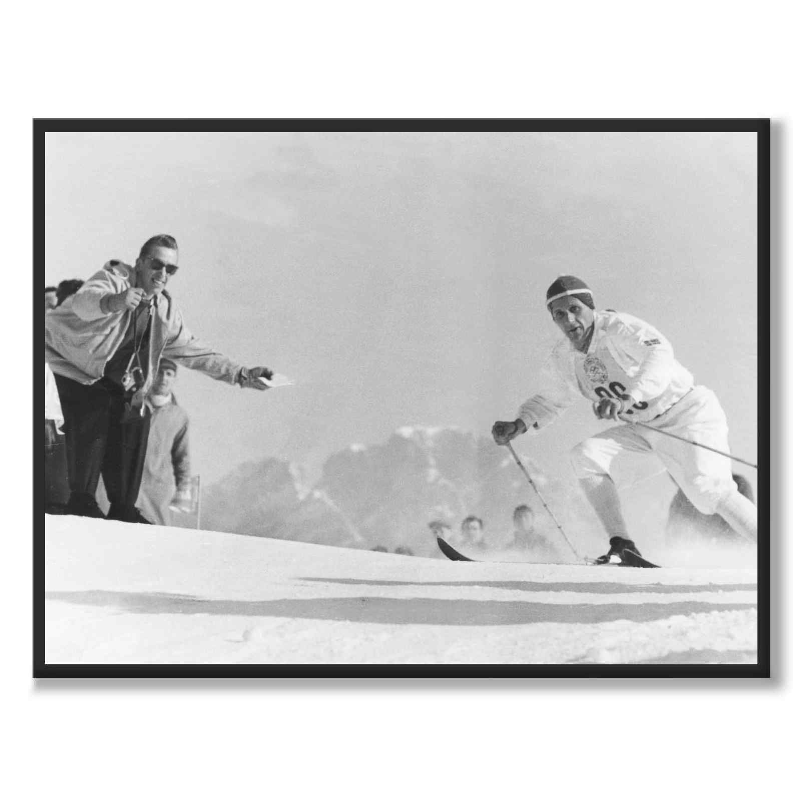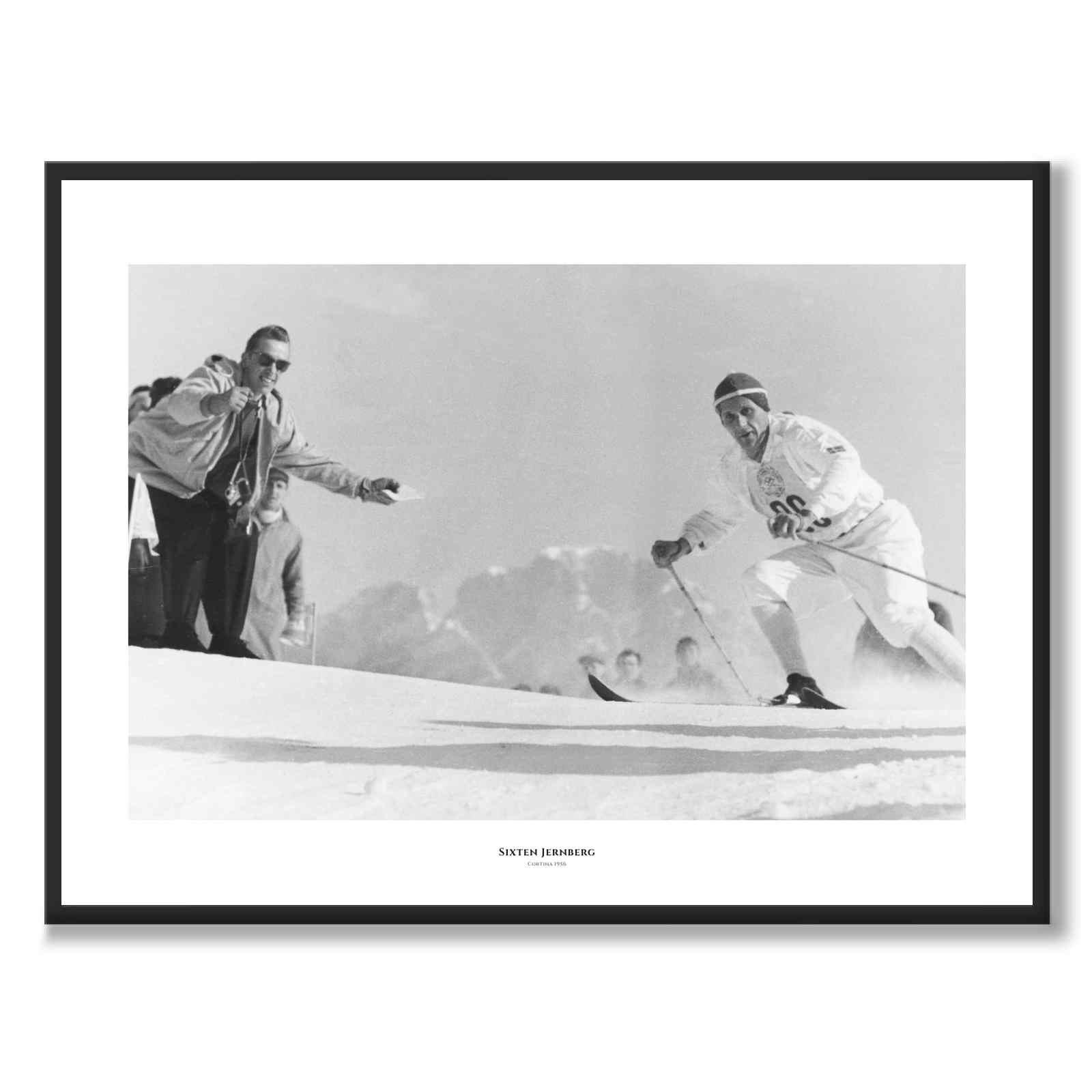 Plakat med bilde av skilegenden S ixten Jernberg (1929-2012) ved OL i Cortina 1956. Her ser vi ham i sporet etter 35 km, heiet frem av medgullvinner Sigge Ericsson.