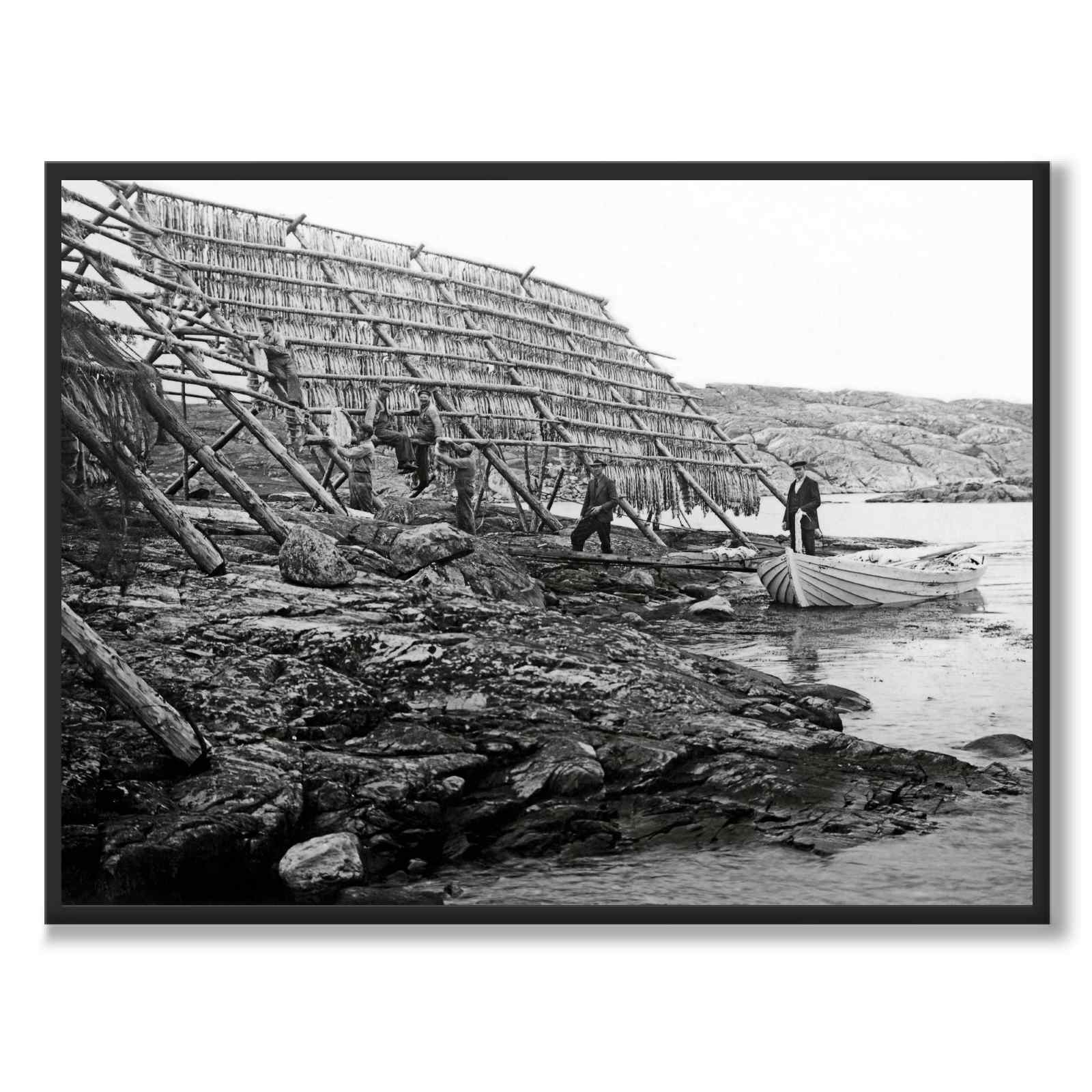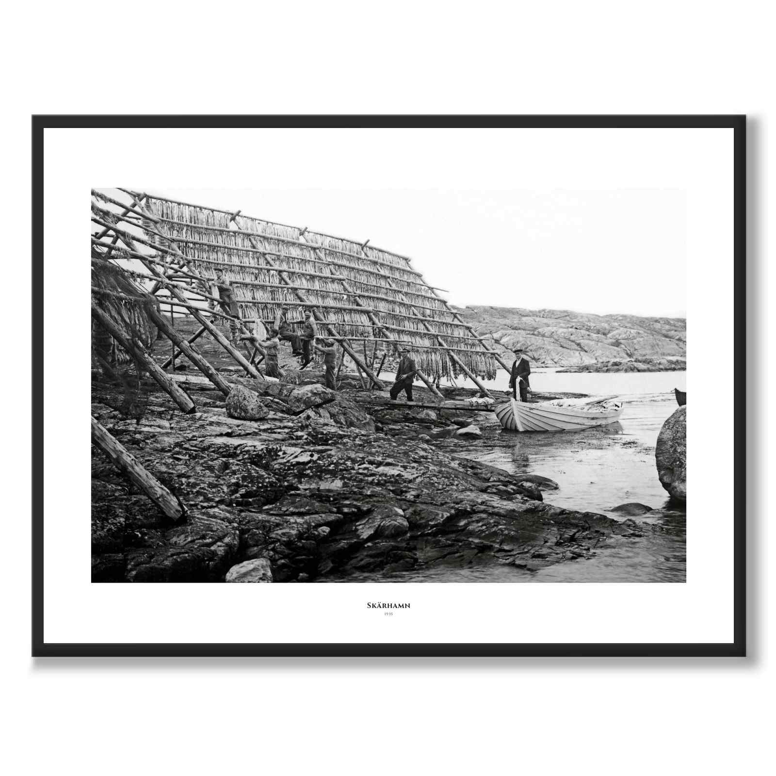 Fiske i Bohuslän i 1935. Menn henger fisket lange på tørkestativ i Skärhamn, Den lille hvite båten flyter over av fisk som er renset og viftet på en spesiell måte slik at de kan tres opp og tørkes med trelameller. I følge bildeteksten henges ca 40.000 kg lange på stativene for å lufttørkes og blir så til lutefisk.