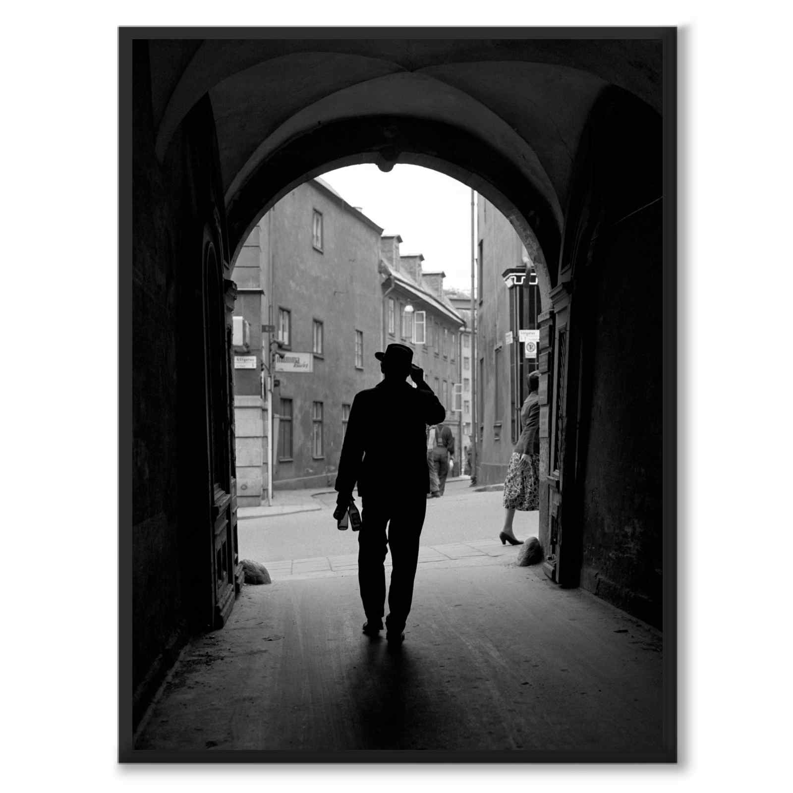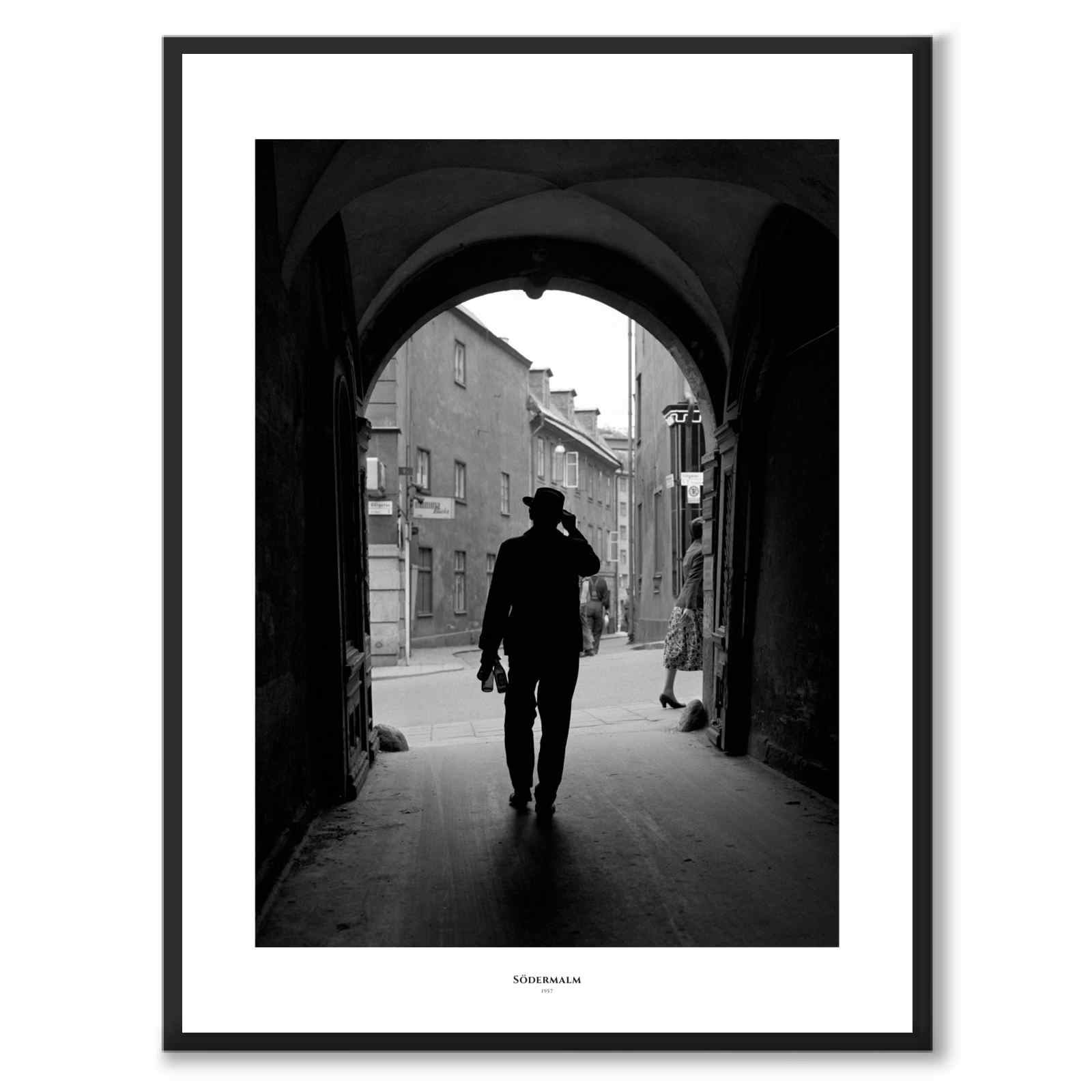 En mann går gjennom buen fra Ebba Brahes Palats mot Götgatan, Södermalm i Stockholm i 1957. I hånden holder han et par glassflasker.