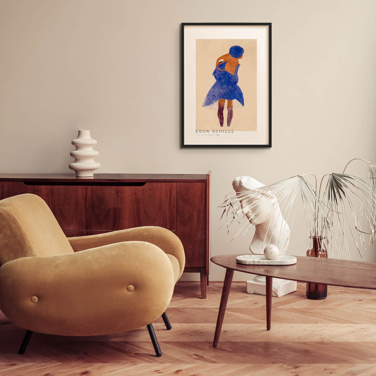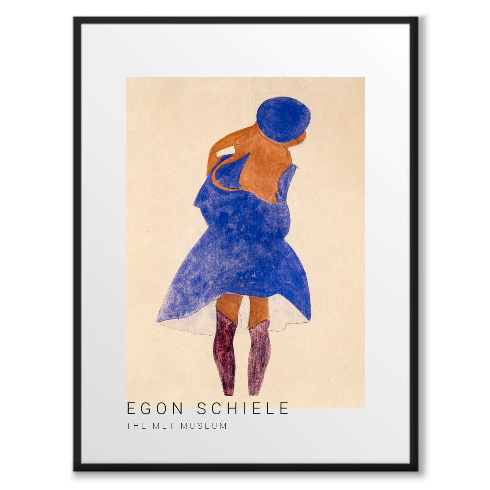 Plakat med illustrasjon av Egon Schiele. Motivet heter Standing Girl, Back View (1908) og viser en jente i en fantastisk blå frakk og beret. Hun går bort fra betrakteren med en nydelig bevegelse. Originalen er på MET Museum i New York.